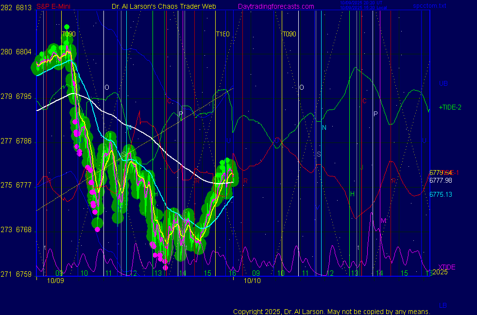 ![]() ![]() Today: per chart 3 on the SPKISS page 09:31 440, 220, 110 up; buy 6771 carried through 12:24 stopped 6796 for +25 Tomorrow: Moon applying conjunction Uranus **************************************************************************** during these volatile times, the point values in these instructions should multiplied by 5 ***************************************************************************** For trade times before 11:00, be sure to use EXMA's that include data from 8:15 Eastern Normal Rules ( as published on daytrading forecasts.com in the tutorial): These fit a Trend or Trend continuation scenario, identified by prices trading within a couple of points of the 110 minute EXMA, taking profits on a 12 point range. 1. Watch for the opportunity to go with the trend or change in trend at the time(s) given. Be alert for the turn coming early or late. Be patient and use the tracking indicators. Plan to trade in the direction of the 110 EXMA coming out of that time frame. Prices should stay on one side of the 110 EXMA and it should be moving, or curl up or down from a flat position. Prices should be within about 2 points of the 110 EXMA. The 20 minute EXMA should have crossed the 110 EXMA, or moved toward it and then pulled away from it. When this setup is clear, enter in the direction of the 110 EXMA with a 3 point stop. *** in volatile markets this may need to be 6 points If each setup is not clear 60 minutes after the given time, skip the trade. 2. Move the stop 1 point each 30 minutes. If the market moves decently, trail it by 3 points ( 6 points in volatile markets). 3. Cover on a 5 point gain**, 90 minutes after entry , at the next Tide turn , or if the prices clearly recross the 110 minute EXMA. ********************************************************************** **FAST MOVE RULE If the trade gains 3 points within 30 minutes of entry, press the stop, using the 20 EXMA as a guide to move the stop to the low or high of each pullback (normally about 15 minutes long) once the move makes a new high or low. Cover any gain of 9* points. *It is OK to use the fast stop rule if a trade starts fast, but to then cover at +5 or +4 if it slows or stalls *** Stall rule: Cover any trade that stalls for more than 45 minutes *** Carry through rule If you are in a trade that is working well, if is OK to carry through the next Tide turn *** GO BIG rule: if morning is a big move (>12 points ), and midday is a congestion or pullback, and the last trade of the day sets up near 2:00, a move greater than 9 points may be captured using the technique illustrated at http://moneytide.com/hans/cc09092008.asp *** VOLATILE MARKET RULE -use with discretion in volatile markets, the 55 minute EXMA used in place of the 110 minute EXMA may provide an earlier and lower risk entry. This is most useful when the market is extremely oversold or overbought and reversing, or during a fast move with minimal dips and one is looking to join the move. |