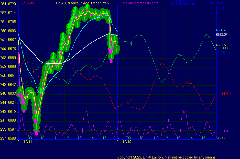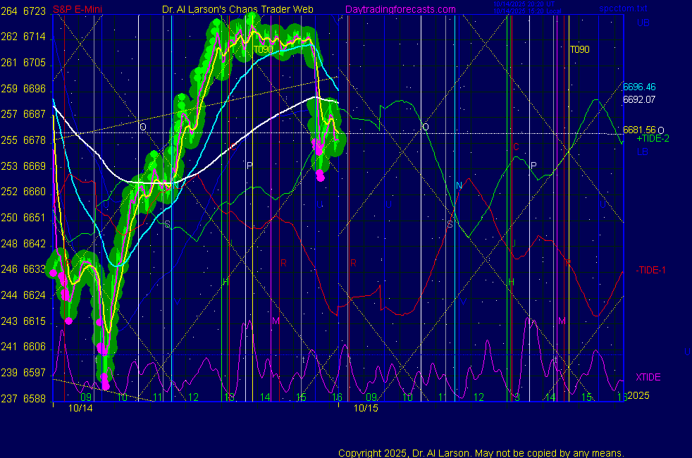 Today: per chart 3 on the SPKISS page 10:28 440, 220, 110 up; buy 6688 stopped for +10 13:44 440, 220, 110 up; buy 6698 stopped for +1 Tomorrow: Moon oppose Pluto, square Chiron **************************************************************************** during these volatile times, the point values in these instructions should multiplied by 5 ***************************************************************************** For trade times before 11:00, be sure to use EXMA's that include data from 8:15 Eastern Normal Rules ( as published on daytrading forecasts.com in the tutorial): These fit a Trend or Trend continuation scenario, identified by prices trading within a couple of points of the 110 minute EXMA, taking profits on a 12 point range. 1. Watch for the opportunity to go with the trend or change in trend at the time(s) given. Be alert for the turn coming early or late. Be patient and use the tracking indicators. Plan to trade in the direction of the 110 EXMA coming out of that time frame. Prices should stay on one side of the 110 EXMA and it should be moving, or curl up or down from a flat position. Prices should be within about 2 points of the 110 EXMA. The 20 minute EXMA should have crossed the 110 EXMA, or moved toward it and then pulled away from it. When this setup is clear, enter in the direction of the 110 EXMA with a 3 point stop. *** in volatile markets this may need to be 6 points If each setup is not clear 60 minutes after the given time, skip the trade. 2. Move the stop 1 point each 30 minutes. If the market moves decently, trail it by 3 points ( 6 points in volatile markets). 3. Cover on a 5 point gain**, 90 minutes after entry , at the next Tide turn , or if the prices clearly recross the 110 minute EXMA. ********************************************************************** **FAST MOVE RULE If the trade gains 3 points within 30 minutes of entry, press the stop, using the 20 EXMA as a guide to move the stop to the low or high of each pullback (normally about 15 minutes long) once the move makes a new high or low. Cover any gain of 9* points. *It is OK to use the fast stop rule if a trade starts fast, but to then cover at +5 or +4 if it slows or stalls *** Stall rule: Cover any trade that stalls for more than 45 minutes *** Carry through rule If you are in a trade that is working well, if is OK to carry through the next Tide turn *** GO BIG rule: if morning is a big move (>12 points ), and midday is a congestion or pullback, and the last trade of the day sets up near 2:00, a move greater than 9 points may be captured using the technique illustrated at http://moneytide.com/hans/cc09092008.asp *** VOLATILE MARKET RULE -use with discretion in volatile markets, the 55 minute EXMA used in place of the 110 minute EXMA may provide an earlier and lower risk entry. This is most useful when the market is extremely oversold or overbought and reversing, or during a fast move with minimal dips and one is looking to join the move. |