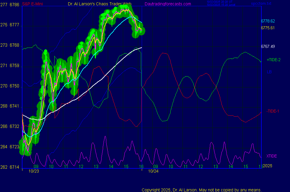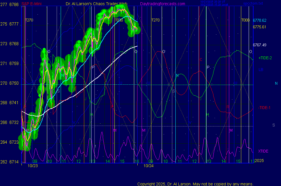 Today: per Chart 3 on SPKISS page 09:30 440, 220, 110 down; sell 6772 carried though 12:33 stopped 6714 for +58 14:15 440 down 110 up -passed Moon T000 timeline was the low Tomorrow: Moon conjoin Mercury, oppose Uranus; octile Venus **************************************************************************** during these volatile times, the point values in these instructions should multiplied by 5 ***************************************************************************** For trade times before 11:00, be sure to use EXMA's that include data from 8:15 Eastern Normal Rules ( as published on daytrading forecasts.com in the tutorial): These fit a Trend or Trend continuation scenario, identified by prices trading within a couple of points of the 110 minute EXMA, taking profits on a 12 point range. 1. Watch for the opportunity to go with the trend or change in trend at the time(s) given. Be alert for the turn coming early or late. Be patient and use the tracking indicators. Plan to trade in the direction of the 110 EXMA coming out of that time frame. Prices should stay on one side of the 110 EXMA and it should be moving, or curl up or down from a flat position. Prices should be within about 2 points of the 110 EXMA. The 20 minute EXMA should have crossed the 110 EXMA, or moved toward it and then pulled away from it. When this setup is clear, enter in the direction of the 110 EXMA with a 3 point stop. *** in volatile markets this may need to be 6 points If each setup is not clear 60 minutes after the given time, skip the trade. 2. Move the stop 1 point each 30 minutes. If the market moves decently, trail it by 3 points ( 6 points in volatile markets). 3. Cover on a 5 point gain**, 90 minutes after entry , at the next Tide turn , or if the prices clearly recross the 110 minute EXMA. ********************************************************************** **FAST MOVE RULE If the trade gains 3 points within 30 minutes of entry, press the stop, using the 20 EXMA as a guide to move the stop to the low or high of each pullback (normally about 15 minutes long) once the move makes a new high or low. Cover any gain of 9* points. *It is OK to use the fast stop rule if a trade starts fast, but to then cover at +5 or +4 if it slows or stalls *** Stall rule: Cover any trade that stalls for more than 45 minutes *** Carry through rule If you are in a trade that is working well, if is OK to carry through the next Tide turn *** GO BIG rule: if morning is a big move (>12 points ), and midday is a congestion or pullback, and the last trade of the day sets up near 2:00, a move greater than 9 points may be captured using the technique illustrated at http://moneytide.com/hans/cc09092008.asp *** VOLATILE MARKET RULE -use with discretion in volatile markets, the 55 minute EXMA used in place of the 110 minute EXMA may provide an earlier and lower risk entry. This is most useful when the market is extremely oversold or overbought and reversing, or during a fast move with minimal dips and one is looking to join the move. |