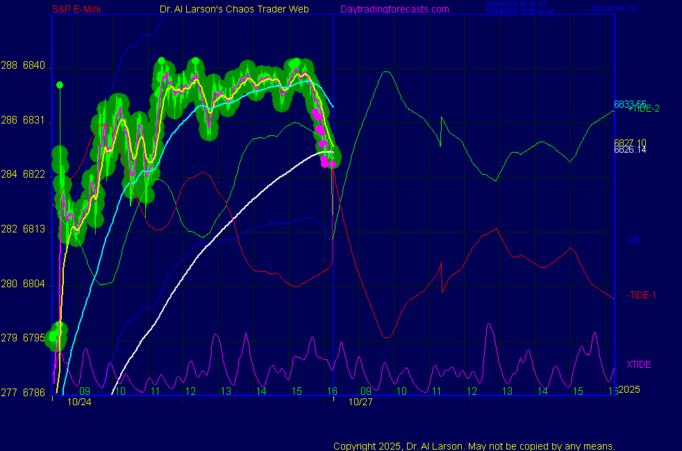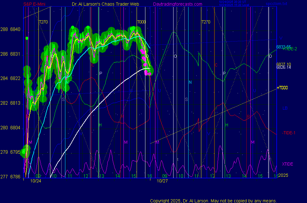 Today: per Chart 3 on SPKISS page 09:31 440, 220, 110 up; buy 6742 carried through 13:25; covered on stall 6782 for +40 Tomorrow: Moon oppose Uranus **************************************************************************** during these volatile times, the point values in these instructions should multiplied by 5 ***************************************************************************** For trade times before 11:00, be sure to use EXMA's that include data from 8:15 Eastern Normal Rules ( as published on daytrading forecasts.com in the tutorial): These fit a Trend or Trend continuation scenario, identified by prices trading within a couple of points of the 110 minute EXMA, taking profits on a 12 point range. 1. Watch for the opportunity to go with the trend or change in trend at the time(s) given. Be alert for the turn coming early or late. Be patient and use the tracking indicators. Plan to trade in the direction of the 110 EXMA coming out of that time frame. Prices should stay on one side of the 110 EXMA and it should be moving, or curl up or down from a flat position. Prices should be within about 2 points of the 110 EXMA. The 20 minute EXMA should have crossed the 110 EXMA, or moved toward it and then pulled away from it. When this setup is clear, enter in the direction of the 110 EXMA with a 3 point stop. *** in volatile markets this may need to be 6 points If each setup is not clear 60 minutes after the given time, skip the trade. 2. Move the stop 1 point each 30 minutes. If the market moves decently, trail it by 3 points ( 6 points in volatile markets). 3. Cover on a 5 point gain**, 90 minutes after entry , at the next Tide turn , or if the prices clearly recross the 110 minute EXMA. ********************************************************************** **FAST MOVE RULE If the trade gains 3 points within 30 minutes of entry, press the stop, using the 20 EXMA as a guide to move the stop to the low or high of each pullback (normally about 15 minutes long) once the move makes a new high or low. Cover any gain of 9* points. *It is OK to use the fast stop rule if a trade starts fast, but to then cover at +5 or +4 if it slows or stalls *** Stall rule: Cover any trade that stalls for more than 45 minutes *** Carry through rule If you are in a trade that is working well, if is OK to carry through the next Tide turn *** GO BIG rule: if morning is a big move (>12 points ), and midday is a congestion or pullback, and the last trade of the day sets up near 2:00, a move greater than 9 points may be captured using the technique illustrated at http://moneytide.com/hans/cc09092008.asp *** VOLATILE MARKET RULE -use with discretion in volatile markets, the 55 minute EXMA used in place of the 110 minute EXMA may provide an earlier and lower risk entry. This is most useful when the market is extremely oversold or overbought and reversing, or during a fast move with minimal dips and one is looking to join the move. |