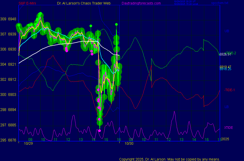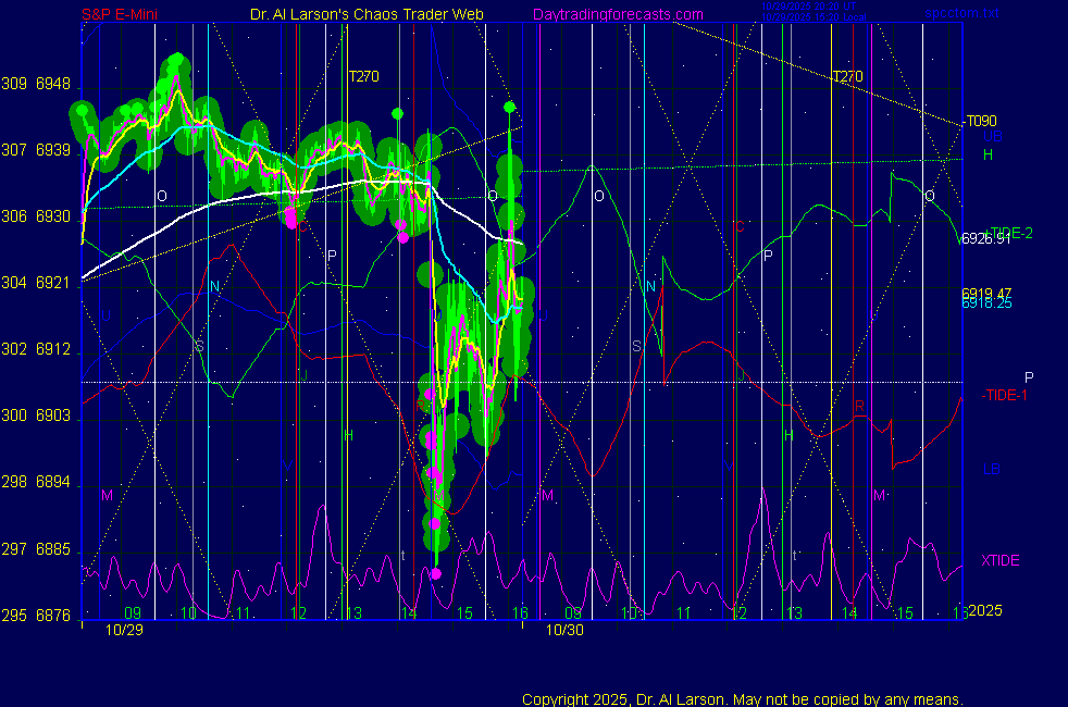 Today: per chart 3 on SPKISS page 09:31 440, 220, 110 up; buy 6919 stopped for +3 12:31 440, 220, 110 up; buy 6918; carried through 14:08 stopped 6936 for +18 Moon square Sun, conjoin Pluto FOMC announcement 2:00 **************************************************************************** during these volatile times, the point values in these instructions should multiplied by 5 ***************************************************************************** For trade times before 11:00, be sure to use EXMA's that include data from 8:15 Eastern Normal Rules ( as published on daytrading forecasts.com in the tutorial): These fit a Trend or Trend continuation scenario, identified by prices trading within a couple of points of the 110 minute EXMA, taking profits on a 12 point range. 1. Watch for the opportunity to go with the trend or change in trend at the time(s) given. Be alert for the turn coming early or late. Be patient and use the tracking indicators. Plan to trade in the direction of the 110 EXMA coming out of that time frame. Prices should stay on one side of the 110 EXMA and it should be moving, or curl up or down from a flat position. Prices should be within about 2 points of the 110 EXMA. The 20 minute EXMA should have crossed the 110 EXMA, or moved toward it and then pulled away from it. When this setup is clear, enter in the direction of the 110 EXMA with a 3 point stop. *** in volatile markets this may need to be 6 points If each setup is not clear 60 minutes after the given time, skip the trade. 2. Move the stop 1 point each 30 minutes. If the market moves decently, trail it by 3 points ( 6 points in volatile markets). 3. Cover on a 5 point gain**, 90 minutes after entry , at the next Tide turn , or if the prices clearly recross the 110 minute EXMA. ********************************************************************** **FAST MOVE RULE If the trade gains 3 points within 30 minutes of entry, press the stop, using the 20 EXMA as a guide to move the stop to the low or high of each pullback (normally about 15 minutes long) once the move makes a new high or low. Cover any gain of 9* points. *It is OK to use the fast stop rule if a trade starts fast, but to then cover at +5 or +4 if it slows or stalls *** Stall rule: Cover any trade that stalls for more than 45 minutes *** Carry through rule If you are in a trade that is working well, if is OK to carry through the next Tide turn *** GO BIG rule: if morning is a big move (>12 points ), and midday is a congestion or pullback, and the last trade of the day sets up near 2:00, a move greater than 9 points may be captured using the technique illustrated at http://moneytide.com/hans/cc09092008.asp *** VOLATILE MARKET RULE -use with discretion in volatile markets, the 55 minute EXMA used in place of the 110 minute EXMA may provide an earlier and lower risk entry. This is most useful when the market is extremely oversold or overbought and reversing, or during a fast move with minimal dips and one is looking to join the move. |