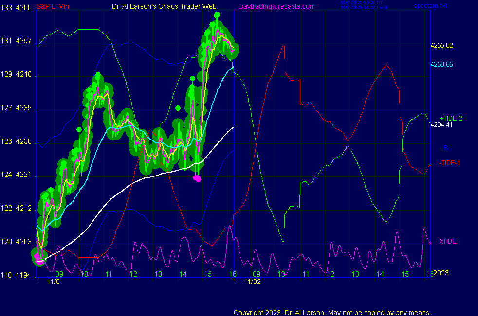 ___________________________________________________________________ charges for this hotline show up on your statement under MicroMedia that's the name of my business, owner of daytradingforecasts.com ___________________________________________________________________ Don't be intimidated by all the complexity of the astro stuff. Our approach is simple. Watch a simple chart, like SP1Day or SPKISS- *- with 3 minute bars, 20 minute (6 or 7 bars) EXMA, and 110 minute (36 bar) EXMA. Look at the trade times in the Strategy section below. When within about 45 minutes of the trade times, follow the rules given in the Standing Instructions. Keep it simple. Be patient. It works over time. Read the Trading the MoonTides Tutorial and Keep It Simple on the List of Charts page. Also read Finer Timing of the MoonTides, and Trading The MoonTide Rainbow. Check the upcoming Economic reports daily. They are linked on the left side of the ListOfCharts page under Economic News all times given are Eastern Ninja Traders: if your are a paying customer, you will see a link on top right side of ListOfCharts page to download the MoonTide indicator ******************************************************************* This is a very Chaotic market where the normal stops and targets will not work. But the EXMAs still do. They are good guides for stops. Targets 3 to 5 times normal are advised. Also, the 3 minute , 1 or 2 day charts may not show you all you need to know, so keep an eye on longer term charts, at least an hourly covering 4 weeks. !!! ******************************************************************** Today: by rule: 09:58 440 flat. 220 down, 110 down -not clear-passed 13:47 440, 220, 110 up 20/110 buy 4193 cover near close for +13 Tomorrow: Second day of FOMC meeting announcement at 14:00, press conference at 14:30 Moon applying square Venus (9:30 - 10:00) **************************************************************************** during these volatile times, the point values in these instructions should multiplied by 5 ***************************************************************************** For trade times before 11:00, be sure to use EXMA's that include data from 8:15 Eastern Normal Rules ( as published on daytrading forecasts.com in the tutorial): These fit a Trend or Trend continuation scenario, identified by prices trading within a couple of points of the 110 minute EXMA, taking profits on a 12 point range. 1. Watch for the opportunity to go with the trend or change in trend at the time(s) given. Be alert for the turn coming early or late. Be patient and use the tracking indicators. Plan to trade in the direction of the 110 EXMA coming out of that time frame. Prices should stay on one side of the 110 EXMA and it should be moving, or curl up or down from a flat position. Prices should be within about 2 points of the 110 EXMA. The 20 minute EXMA should have crossed the 110 EXMA, or moved toward it and then pulled away from it. When this setup is clear, enter in the direction of the 110 EXMA with a 3 point stop. *** in volatile markets this may need to be 6 points If each setup is not clear 60 minutes after the given time, skip the trade. 2. Move the stop 1 point each 30 minutes. If the market moves decently, trail it by 3 points ( 6 points in volatile markets). 3. Cover on a 5 point gain**, 90 minutes after entry , at the next Tide turn , or if the prices clearly recross the 110 minute EXMA. ********************************************************************** **FAST MOVE RULE If the trade gains 3 points within 30 minutes of entry, press the stop, using the 20 EXMA as a guide to move the stop to the low or high of each pullback (normally about 15 minutes long) once the move makes a new high or low. Cover any gain of 9* points. *It is OK to use the fast stop rule if a trade starts fast, but to then cover at +5 or +4 if it slows or stalls *** Stall rule: Cover any trade that stalls for more than 45 minutes *** Carry through rule If you are in a trade that is working well, if is OK to carry through the next Tide turn *** GO BIG rule: if morning is a big move (>12 points ), and midday is a congestion or pullback, and the last trade of the day sets up near 2:00, a move greater than 9 points may be captured using the technique illustrated at http://moneytide.com/hans/cc09092008.asp *** VOLATILE MARKET RULE -use with discretion in volatile markets, the 55 minute EXMA used in place of the 110 minute EXMA may provide an earlier and lower risk entry. This is most useful when the market is extremely oversold or overbought and reversing, or during a fast move with minimal dips and one is looking to join the move. |