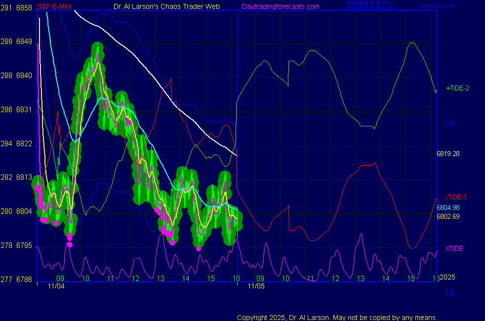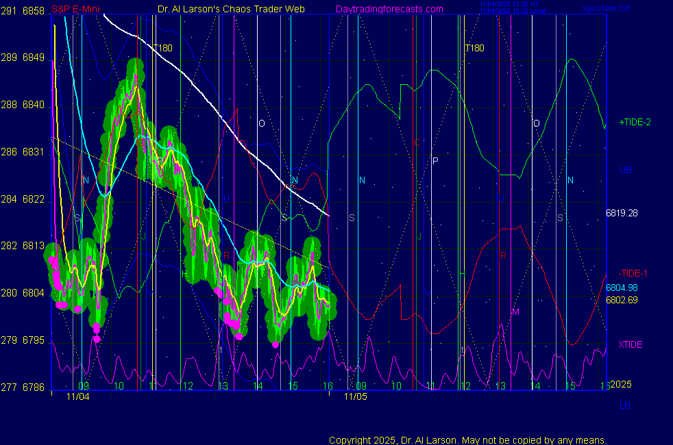Today: as per chart 3 on SPKISS page 10:46 440, 220, 110 down; sell 6874 stopped 6862 for +12 13:43 440, 220, 110 up; buy 6890 stopped for -6 **************************************************************************** during these volatile times, the point values in these instructions should multiplied by 5 ***************************************************************************** For trade times before 11:00, be sure to use EXMA's that include data from 8:15 Eastern Normal Rules ( as published on daytrading forecasts.com in the tutorial): These fit a Trend or Trend continuation scenario, identified by prices trading within a couple of points of the 110 minute EXMA, taking profits on a 12 point range. 1. Watch for the opportunity to go with the trend or change in trend at the time(s) given. Be alert for the turn coming early or late. Be patient and use the tracking indicators. Plan to trade in the direction of the 110 EXMA coming out of that time frame. Prices should stay on one side of the 110 EXMA and it should be moving, or curl up or down from a flat position. Prices should be within about 2 points of the 110 EXMA. The 20 minute EXMA should have crossed the 110 EXMA, or moved toward it and then pulled away from it. When this setup is clear, enter in the direction of the 110 EXMA with a 3 point stop. *** in volatile markets this may need to be 6 points If each setup is not clear 60 minutes after the given time, skip the trade. 2. Move the stop 1 point each 30 minutes. If the market moves decently, trail it by 3 points ( 6 points in volatile markets). 3. Cover on a 5 point gain**, 90 minutes after entry , at the next Tide turn , or if the prices clearly recross the 110 minute EXMA. ********************************************************************** **FAST MOVE RULE If the trade gains 3 points within 30 minutes of entry, press the stop, using the 20 EXMA as a guide to move the stop to the low or high of each pullback (normally about 15 minutes long) once the move makes a new high or low. Cover any gain of 9* points. *It is OK to use the fast stop rule if a trade starts fast, but to then cover at +5 or +4 if it slows or stalls *** Stall rule: Cover any trade that stalls for more than 45 minutes *** Carry through rule If you are in a trade that is working well, if is OK to carry through the next Tide turn *** GO BIG rule: if morning is a big move (>12 points ), and midday is a congestion or pullback, and the last trade of the day sets up near 2:00, a move greater than 9 points may be captured using the technique illustrated at http://moneytide.com/hans/cc09092008.asp *** VOLATILE MARKET RULE -use with discretion in volatile markets, the 55 minute EXMA used in place of the 110 minute EXMA may provide an earlier and lower risk entry. This is most useful when the market is extremely oversold or overbought and reversing, or during a fast move with minimal dips and one is looking to join the move. |