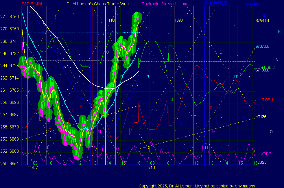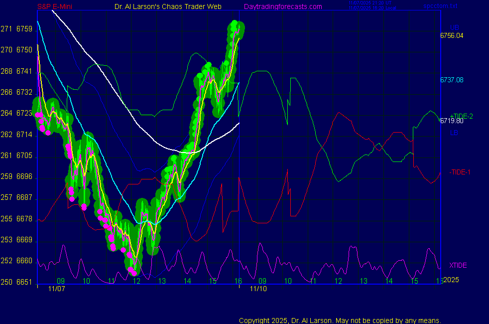 Today: as per chart 3 on SPKISS page 440, 220, 110 down; sell 6822 stopped 6748 for +74 **************************************************************************** during these volatile times, the point values in these instructions should multiplied by 5 ***************************************************************************** For trade times before 11:00, be sure to use EXMA's that include data from 8:15 Eastern Normal Rules ( as published on daytrading forecasts.com in the tutorial): These fit a Trend or Trend continuation scenario, identified by prices trading within a couple of points of the 110 minute EXMA, taking profits on a 12 point range. 1. Watch for the opportunity to go with the trend or change in trend at the time(s) given. Be alert for the turn coming early or late. Be patient and use the tracking indicators. Plan to trade in the direction of the 110 EXMA coming out of that time frame. Prices should stay on one side of the 110 EXMA and it should be moving, or curl up or down from a flat position. Prices should be within about 2 points of the 110 EXMA. The 20 minute EXMA should have crossed the 110 EXMA, or moved toward it and then pulled away from it. When this setup is clear, enter in the direction of the 110 EXMA with a 3 point stop. *** in volatile markets this may need to be 6 points If each setup is not clear 60 minutes after the given time, skip the trade. 2. Move the stop 1 point each 30 minutes. If the market moves decently, trail it by 3 points ( 6 points in volatile markets). 3. Cover on a 5 point gain**, 90 minutes after entry , at the next Tide turn , or if the prices clearly recross the 110 minute EXMA. ********************************************************************** **FAST MOVE RULE If the trade gains 3 points within 30 minutes of entry, press the stop, using the 20 EXMA as a guide to move the stop to the low or high of each pullback (normally about 15 minutes long) once the move makes a new high or low. Cover any gain of 9* points. *It is OK to use the fast stop rule if a trade starts fast, but to then cover at +5 or +4 if it slows or stalls *** Stall rule: Cover any trade that stalls for more than 45 minutes *** Carry through rule If you are in a trade that is working well, if is OK to carry through the next Tide turn *** GO BIG rule: if morning is a big move (>12 points ), and midday is a congestion or pullback, and the last trade of the day sets up near 2:00, a move greater than 9 points may be captured using the technique illustrated at http://moneytide.com/hans/cc09092008.asp *** VOLATILE MARKET RULE -use with discretion in volatile markets, the 55 minute EXMA used in place of the 110 minute EXMA may provide an earlier and lower risk entry. This is most useful when the market is extremely oversold or overbought and reversing, or during a fast move with minimal dips and one is looking to join the move. |