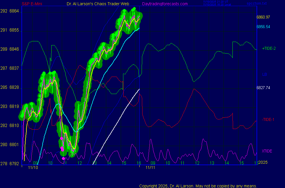 Today: as per Chaos Clinic +23, -3 **************************************************************************** during these volatile times, the point values in these instructions should multiplied by 5 ***************************************************************************** For trade times before 11:00, be sure to use EXMA's that include data from 8:15 Eastern Normal Rules ( as published on daytrading forecasts.com in the tutorial): These fit a Trend or Trend continuation scenario, identified by prices trading within a couple of points of the 110 minute EXMA, taking profits on a 12 point range. 1. Watch for the opportunity to go with the trend or change in trend at the time(s) given. Be alert for the turn coming early or late. Be patient and use the tracking indicators. Plan to trade in the direction of the 110 EXMA coming out of that time frame. Prices should stay on one side of the 110 EXMA and it should be moving, or curl up or down from a flat position. Prices should be within about 2 points of the 110 EXMA. The 20 minute EXMA should have crossed the 110 EXMA, or moved toward it and then pulled away from it. When this setup is clear, enter in the direction of the 110 EXMA with a 3 point stop. *** in volatile markets this may need to be 6 points If each setup is not clear 60 minutes after the given time, skip the trade. 2. Move the stop 1 point each 30 minutes. If the market moves decently, trail it by 3 points ( 6 points in volatile markets). 3. Cover on a 5 point gain**, 90 minutes after entry , at the next Tide turn , or if the prices clearly recross the 110 minute EXMA. ********************************************************************** **FAST MOVE RULE If the trade gains 3 points within 30 minutes of entry, press the stop, using the 20 EXMA as a guide to move the stop to the low or high of each pullback (normally about 15 minutes long) once the move makes a new high or low. Cover any gain of 9* points. *It is OK to use the fast stop rule if a trade starts fast, but to then cover at +5 or +4 if it slows or stalls *** Stall rule: Cover any trade that stalls for more than 45 minutes *** Carry through rule If you are in a trade that is working well, if is OK to carry through the next Tide turn *** GO BIG rule: if morning is a big move (>12 points ), and midday is a congestion or pullback, and the last trade of the day sets up near 2:00, a move greater than 9 points may be captured using the technique illustrated at http://moneytide.com/hans/cc09092008.asp *** VOLATILE MARKET RULE -use with discretion in volatile markets, the 55 minute EXMA used in place of the 110 minute EXMA may provide an earlier and lower risk entry. This is most useful when the market is extremely oversold or overbought and reversing, or during a fast move with minimal dips and one is looking to join the move. |