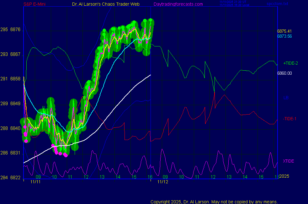 Today: as per chart 3 on SPKISS page 10:32 440 up, 220 down -pass 12:15 440, 220, 110 up; buy 6815 covered for +40 **************************************************************************** during these volatile times, the point values in these instructions should multiplied by 5 ***************************************************************************** For trade times before 11:00, be sure to use EXMA's that include data from 8:15 Eastern Normal Rules ( as published on daytrading forecasts.com in the tutorial): These fit a Trend or Trend continuation scenario, identified by prices trading within a couple of points of the 110 minute EXMA, taking profits on a 12 point range. 1. Watch for the opportunity to go with the trend or change in trend at the time(s) given. Be alert for the turn coming early or late. Be patient and use the tracking indicators. Plan to trade in the direction of the 110 EXMA coming out of that time frame. Prices should stay on one side of the 110 EXMA and it should be moving, or curl up or down from a flat position. Prices should be within about 2 points of the 110 EXMA. The 20 minute EXMA should have crossed the 110 EXMA, or moved toward it and then pulled away from it. When this setup is clear, enter in the direction of the 110 EXMA with a 3 point stop. *** in volatile markets this may need to be 6 points If each setup is not clear 60 minutes after the given time, skip the trade. 2. Move the stop 1 point each 30 minutes. If the market moves decently, trail it by 3 points ( 6 points in volatile markets). 3. Cover on a 5 point gain**, 90 minutes after entry , at the next Tide turn , or if the prices clearly recross the 110 minute EXMA. ********************************************************************** **FAST MOVE RULE If the trade gains 3 points within 30 minutes of entry, press the stop, using the 20 EXMA as a guide to move the stop to the low or high of each pullback (normally about 15 minutes long) once the move makes a new high or low. Cover any gain of 9* points. *It is OK to use the fast stop rule if a trade starts fast, but to then cover at +5 or +4 if it slows or stalls *** Stall rule: Cover any trade that stalls for more than 45 minutes *** Carry through rule If you are in a trade that is working well, if is OK to carry through the next Tide turn *** GO BIG rule: if morning is a big move (>12 points ), and midday is a congestion or pullback, and the last trade of the day sets up near 2:00, a move greater than 9 points may be captured using the technique illustrated at http://moneytide.com/hans/cc09092008.asp *** VOLATILE MARKET RULE -use with discretion in volatile markets, the 55 minute EXMA used in place of the 110 minute EXMA may provide an earlier and lower risk entry. This is most useful when the market is extremely oversold or overbought and reversing, or during a fast move with minimal dips and one is looking to join the move. |