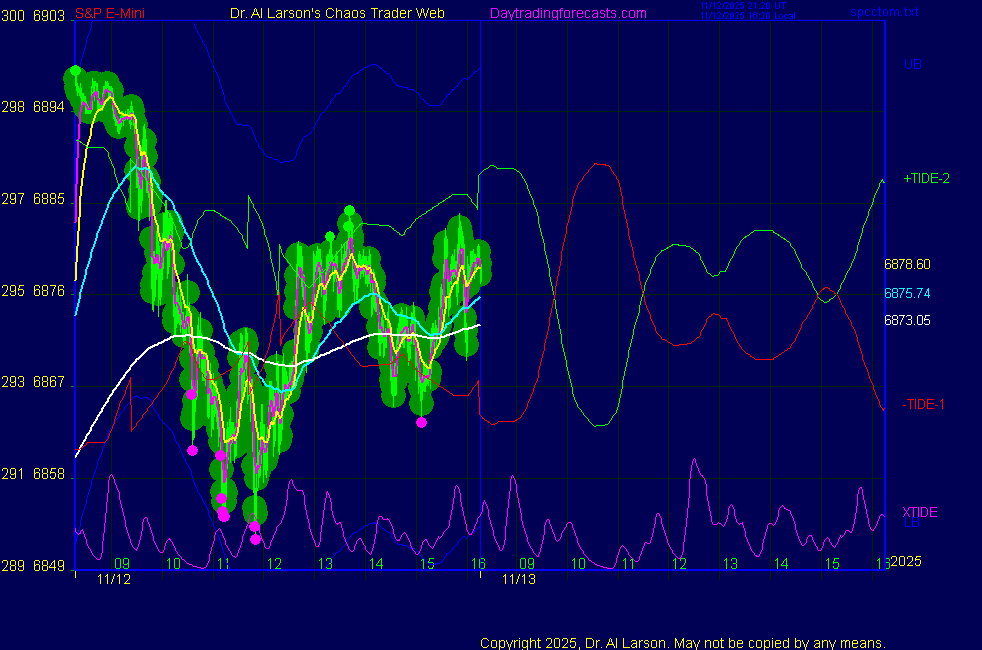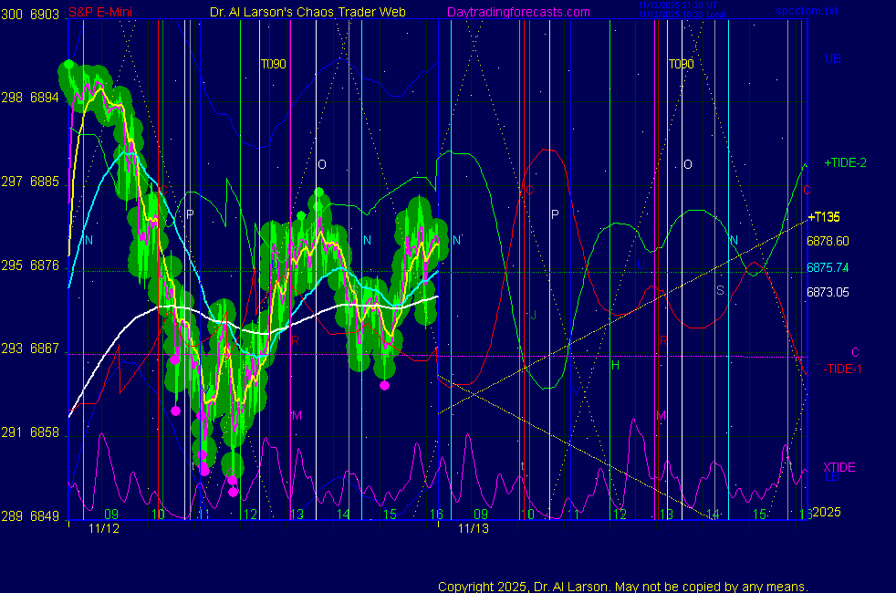 Today: as per chart 3 on SPKISS page 09:31 440 up, 220 down -pass 12:02 440, 220, 110 up; buy 6845 carried through 14:39 , stop 6875 for +30 **************************************************************************** during these volatile times, the point values in these instructions should multiplied by 5 ***************************************************************************** For trade times before 11:00, be sure to use EXMA's that include data from 8:15 Eastern Normal Rules ( as published on daytrading forecasts.com in the tutorial): These fit a Trend or Trend continuation scenario, identified by prices trading within a couple of points of the 110 minute EXMA, taking profits on a 12 point range. 1. Watch for the opportunity to go with the trend or change in trend at the time(s) given. Be alert for the turn coming early or late. Be patient and use the tracking indicators. Plan to trade in the direction of the 110 EXMA coming out of that time frame. Prices should stay on one side of the 110 EXMA and it should be moving, or curl up or down from a flat position. Prices should be within about 2 points of the 110 EXMA. The 20 minute EXMA should have crossed the 110 EXMA, or moved toward it and then pulled away from it. When this setup is clear, enter in the direction of the 110 EXMA with a 3 point stop. *** in volatile markets this may need to be 6 points If each setup is not clear 60 minutes after the given time, skip the trade. 2. Move the stop 1 point each 30 minutes. If the market moves decently, trail it by 3 points ( 6 points in volatile markets). 3. Cover on a 5 point gain**, 90 minutes after entry , at the next Tide turn , or if the prices clearly recross the 110 minute EXMA. ********************************************************************** **FAST MOVE RULE If the trade gains 3 points within 30 minutes of entry, press the stop, using the 20 EXMA as a guide to move the stop to the low or high of each pullback (normally about 15 minutes long) once the move makes a new high or low. Cover any gain of 9* points. *It is OK to use the fast stop rule if a trade starts fast, but to then cover at +5 or +4 if it slows or stalls *** Stall rule: Cover any trade that stalls for more than 45 minutes *** Carry through rule If you are in a trade that is working well, if is OK to carry through the next Tide turn *** GO BIG rule: if morning is a big move (>12 points ), and midday is a congestion or pullback, and the last trade of the day sets up near 2:00, a move greater than 9 points may be captured using the technique illustrated at http://moneytide.com/hans/cc09092008.asp *** VOLATILE MARKET RULE -use with discretion in volatile markets, the 55 minute EXMA used in place of the 110 minute EXMA may provide an earlier and lower risk entry. This is most useful when the market is extremely oversold or overbought and reversing, or during a fast move with minimal dips and one is looking to join the move. |