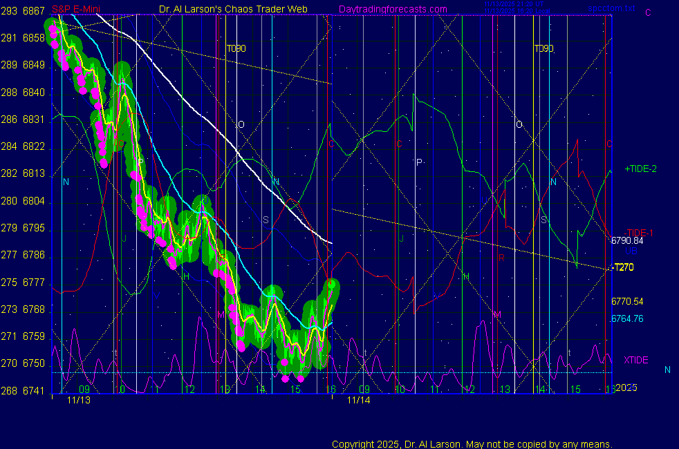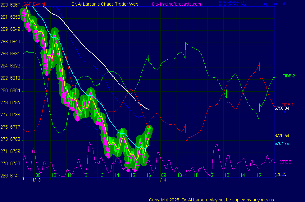 Today: as per chart 3 on SPKISS page 10:28 20, 110, 220 down; sell 6878 stopped 6862 for +16 12:55 440, 220, 110 up; buy 6872 covered on stall for +5 **************************************************************************** during these volatile times, the point values in these instructions should multiplied by 5 ***************************************************************************** For trade times before 11:00, be sure to use EXMA's that include data from 8:15 Eastern Normal Rules ( as published on daytrading forecasts.com in the tutorial): These fit a Trend or Trend continuation scenario, identified by prices trading within a couple of points of the 110 minute EXMA, taking profits on a 12 point range. 1. Watch for the opportunity to go with the trend or change in trend at the time(s) given. Be alert for the turn coming early or late. Be patient and use the tracking indicators. Plan to trade in the direction of the 110 EXMA coming out of that time frame. Prices should stay on one side of the 110 EXMA and it should be moving, or curl up or down from a flat position. Prices should be within about 2 points of the 110 EXMA. The 20 minute EXMA should have crossed the 110 EXMA, or moved toward it and then pulled away from it. When this setup is clear, enter in the direction of the 110 EXMA with a 3 point stop. *** in volatile markets this may need to be 6 points If each setup is not clear 60 minutes after the given time, skip the trade. 2. Move the stop 1 point each 30 minutes. If the market moves decently, trail it by 3 points ( 6 points in volatile markets). 3. Cover on a 5 point gain**, 90 minutes after entry , at the next Tide turn , or if the prices clearly recross the 110 minute EXMA. ********************************************************************** **FAST MOVE RULE If the trade gains 3 points within 30 minutes of entry, press the stop, using the 20 EXMA as a guide to move the stop to the low or high of each pullback (normally about 15 minutes long) once the move makes a new high or low. Cover any gain of 9* points. *It is OK to use the fast stop rule if a trade starts fast, but to then cover at +5 or +4 if it slows or stalls *** Stall rule: Cover any trade that stalls for more than 45 minutes *** Carry through rule If you are in a trade that is working well, if is OK to carry through the next Tide turn *** GO BIG rule: if morning is a big move (>12 points ), and midday is a congestion or pullback, and the last trade of the day sets up near 2:00, a move greater than 9 points may be captured using the technique illustrated at http://moneytide.com/hans/cc09092008.asp *** VOLATILE MARKET RULE -use with discretion in volatile markets, the 55 minute EXMA used in place of the 110 minute EXMA may provide an earlier and lower risk entry. This is most useful when the market is extremely oversold or overbought and reversing, or during a fast move with minimal dips and one is looking to join the move. |