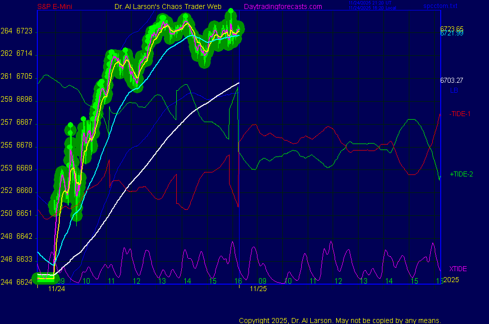 Today: as per Chaos Clinic +33 **************************************************************************** during these volatile times, the point values in these instructions should multiplied by 5 ***************************************************************************** For trade times before 11:00, be sure to use EXMA's that include data from 8:15 Eastern Normal Rules ( as published on daytrading forecasts.com in the tutorial): These fit a Trend or Trend continuation scenario, identified by prices trading within a couple of points of the 110 minute EXMA, taking profits on a 12 point range. 1. Watch for the opportunity to go with the trend or change in trend at the time(s) given. Be alert for the turn coming early or late. Be patient and use the tracking indicators. Plan to trade in the direction of the 110 EXMA coming out of that time frame. Prices should stay on one side of the 110 EXMA and it should be moving, or curl up or down from a flat position. Prices should be within about 2 points of the 110 EXMA. The 20 minute EXMA should have crossed the 110 EXMA, or moved toward it and then pulled away from it. When this setup is clear, enter in the direction of the 110 EXMA with a 3 point stop. *** in volatile markets this may need to be 6 points If each setup is not clear 60 minutes after the given time, skip the trade. 2. Move the stop 1 point each 30 minutes. If the market moves decently, trail it by 3 points ( 6 points in volatile markets). 3. Cover on a 5 point gain**, 90 minutes after entry , at the next Tide turn , or if the prices clearly recross the 110 minute EXMA. ********************************************************************** **FAST MOVE RULE If the trade gains 3 points within 30 minutes of entry, press the stop, using the 20 EXMA as a guide to move the stop to the low or high of each pullback (normally about 15 minutes long) once the move makes a new high or low. Cover any gain of 9* points. *It is OK to use the fast stop rule if a trade starts fast, but to then cover at +5 or +4 if it slows or stalls *** Stall rule: Cover any trade that stalls for more than 45 minutes *** Carry through rule If you are in a trade that is working well, if is OK to carry through the next Tide turn *** GO BIG rule: if morning is a big move (>12 points ), and midday is a congestion or pullback, and the last trade of the day sets up near 2:00, a move greater than 9 points may be captured using the technique illustrated at http://moneytide.com/hans/cc09092008.asp *** VOLATILE MARKET RULE -use with discretion in volatile markets, the 55 minute EXMA used in place of the 110 minute EXMA may provide an earlier and lower risk entry. This is most useful when the market is extremely oversold or overbought and reversing, or during a fast move with minimal dips and one is looking to join the move. |
