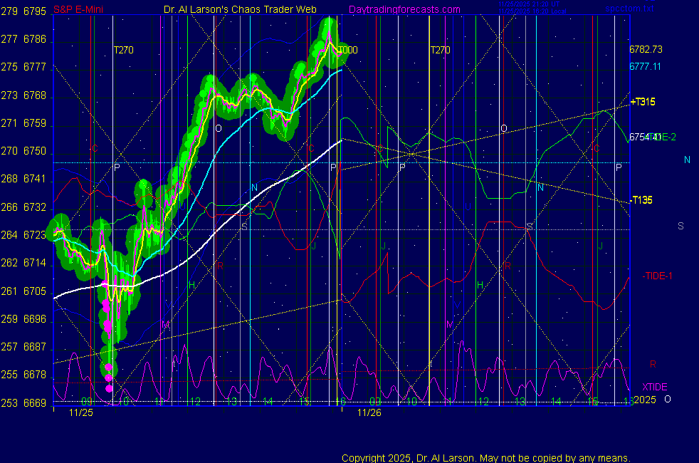 Today: as per chart 3 on the SPKISS page 09:31 440, 220, 110 up; buy 6670 carried through 13:48 stopped 6722 for +52 **************************************************************************** during these volatile times, the point values in these instructions should multiplied by 5 ***************************************************************************** For trade times before 11:00, be sure to use EXMA's that include data from 8:15 Eastern Normal Rules ( as published on daytrading forecasts.com in the tutorial): These fit a Trend or Trend continuation scenario, identified by prices trading within a couple of points of the 110 minute EXMA, taking profits on a 12 point range. 1. Watch for the opportunity to go with the trend or change in trend at the time(s) given. Be alert for the turn coming early or late. Be patient and use the tracking indicators. Plan to trade in the direction of the 110 EXMA coming out of that time frame. Prices should stay on one side of the 110 EXMA and it should be moving, or curl up or down from a flat position. Prices should be within about 2 points of the 110 EXMA. The 20 minute EXMA should have crossed the 110 EXMA, or moved toward it and then pulled away from it. When this setup is clear, enter in the direction of the 110 EXMA with a 3 point stop. *** in volatile markets this may need to be 6 points If each setup is not clear 60 minutes after the given time, skip the trade. 2. Move the stop 1 point each 30 minutes. If the market moves decently, trail it by 3 points ( 6 points in volatile markets). 3. Cover on a 5 point gain**, 90 minutes after entry , at the next Tide turn , or if the prices clearly recross the 110 minute EXMA. ********************************************************************** **FAST MOVE RULE If the trade gains 3 points within 30 minutes of entry, press the stop, using the 20 EXMA as a guide to move the stop to the low or high of each pullback (normally about 15 minutes long) once the move makes a new high or low. Cover any gain of 9* points. *It is OK to use the fast stop rule if a trade starts fast, but to then cover at +5 or +4 if it slows or stalls *** Stall rule: Cover any trade that stalls for more than 45 minutes *** Carry through rule If you are in a trade that is working well, if is OK to carry through the next Tide turn *** GO BIG rule: if morning is a big move (>12 points ), and midday is a congestion or pullback, and the last trade of the day sets up near 2:00, a move greater than 9 points may be captured using the technique illustrated at http://moneytide.com/hans/cc09092008.asp *** VOLATILE MARKET RULE -use with discretion in volatile markets, the 55 minute EXMA used in place of the 110 minute EXMA may provide an earlier and lower risk entry. This is most useful when the market is extremely oversold or overbought and reversing, or during a fast move with minimal dips and one is looking to join the move. |