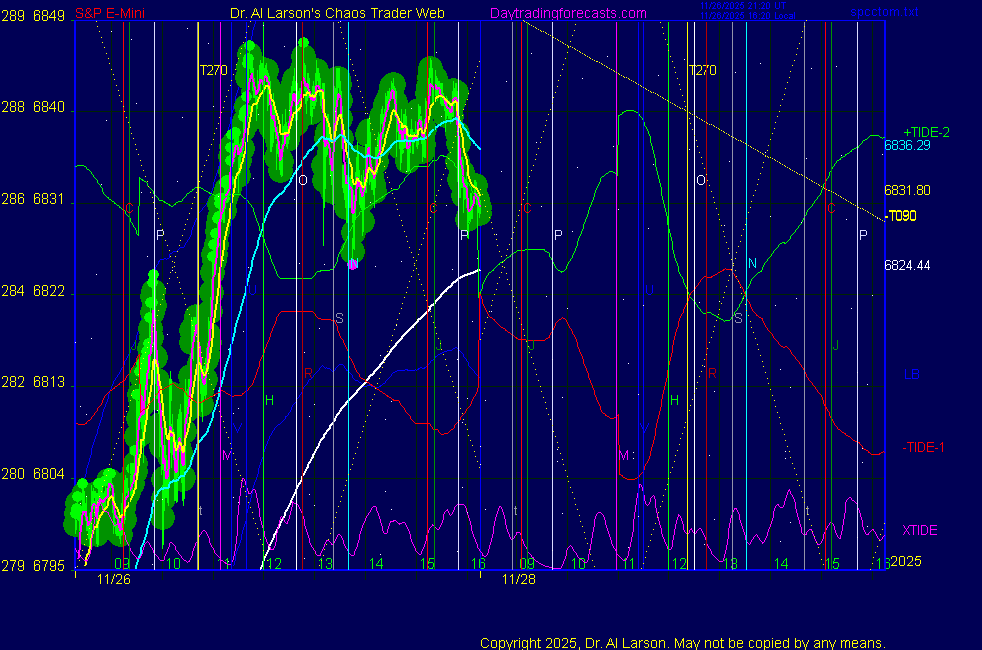 Today: as per chart 3 on the SPKISS page 10:27 440, 220, 110 up; bought 6732; carried through 12:42 stopped 6765 for +33 14:18 440 up, 110 down; passed **************************************************************************** during these volatile times, the point values in these instructions should multiplied by 5 ***************************************************************************** For trade times before 11:00, be sure to use EXMA's that include data from 8:15 Eastern Normal Rules ( as published on daytrading forecasts.com in the tutorial): These fit a Trend or Trend continuation scenario, identified by prices trading within a couple of points of the 110 minute EXMA, taking profits on a 12 point range. 1. Watch for the opportunity to go with the trend or change in trend at the time(s) given. Be alert for the turn coming early or late. Be patient and use the tracking indicators. Plan to trade in the direction of the 110 EXMA coming out of that time frame. Prices should stay on one side of the 110 EXMA and it should be moving, or curl up or down from a flat position. Prices should be within about 2 points of the 110 EXMA. The 20 minute EXMA should have crossed the 110 EXMA, or moved toward it and then pulled away from it. When this setup is clear, enter in the direction of the 110 EXMA with a 3 point stop. *** in volatile markets this may need to be 6 points If each setup is not clear 60 minutes after the given time, skip the trade. 2. Move the stop 1 point each 30 minutes. If the market moves decently, trail it by 3 points ( 6 points in volatile markets). 3. Cover on a 5 point gain**, 90 minutes after entry , at the next Tide turn , or if the prices clearly recross the 110 minute EXMA. ********************************************************************** **FAST MOVE RULE If the trade gains 3 points within 30 minutes of entry, press the stop, using the 20 EXMA as a guide to move the stop to the low or high of each pullback (normally about 15 minutes long) once the move makes a new high or low. Cover any gain of 9* points. *It is OK to use the fast stop rule if a trade starts fast, but to then cover at +5 or +4 if it slows or stalls *** Stall rule: Cover any trade that stalls for more than 45 minutes *** Carry through rule If you are in a trade that is working well, if is OK to carry through the next Tide turn *** GO BIG rule: if morning is a big move (>12 points ), and midday is a congestion or pullback, and the last trade of the day sets up near 2:00, a move greater than 9 points may be captured using the technique illustrated at http://moneytide.com/hans/cc09092008.asp *** VOLATILE MARKET RULE -use with discretion in volatile markets, the 55 minute EXMA used in place of the 110 minute EXMA may provide an earlier and lower risk entry. This is most useful when the market is extremely oversold or overbought and reversing, or during a fast move with minimal dips and one is looking to join the move. |