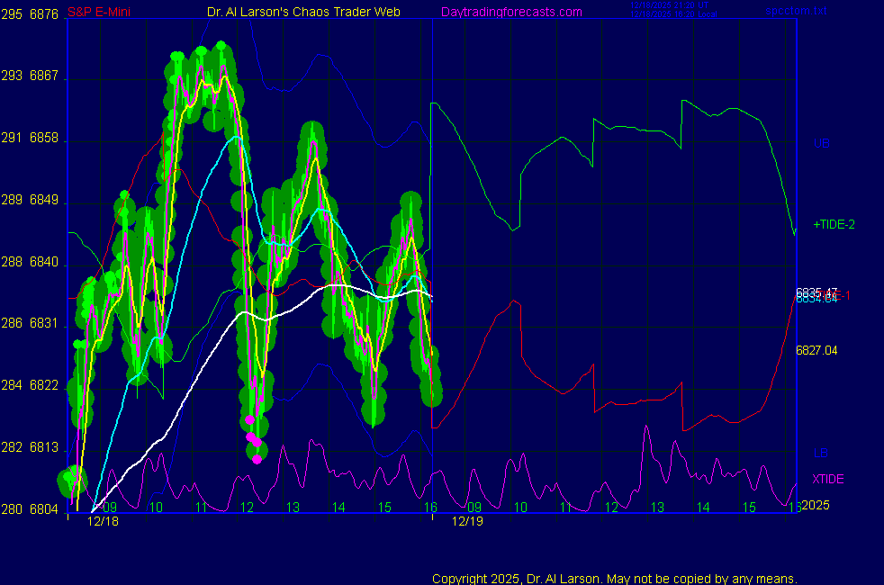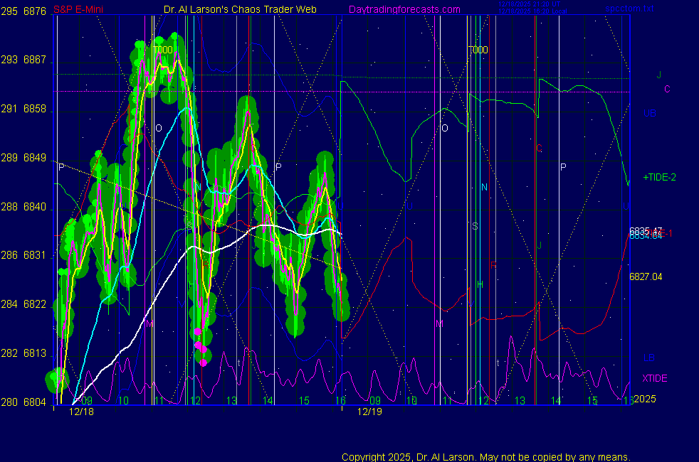 Today: as per Chart 3 on SPKISS page 10:05 440, 220, 110 down; sell 6850 carried through 13:36 covered 6785 for +65 Tomorrow: Moon conjoin Mercury, square Node **************************************************************************** during these volatile times, the point values in these instructions should multiplied by 5 ***************************************************************************** For trade times before 11:00, be sure to use EXMA's that include data from 8:15 Eastern Normal Rules ( as published on daytrading forecasts.com in the tutorial): These fit a Trend or Trend continuation scenario, identified by prices trading within a couple of points of the 110 minute EXMA, taking profits on a 12 point range. 1. Watch for the opportunity to go with the trend or change in trend at the time(s) given. Be alert for the turn coming early or late. Be patient and use the tracking indicators. Plan to trade in the direction of the 110 EXMA coming out of that time frame. Prices should stay on one side of the 110 EXMA and it should be moving, or curl up or down from a flat position. Prices should be within about 2 points of the 110 EXMA. The 20 minute EXMA should have crossed the 110 EXMA, or moved toward it and then pulled away from it. When this setup is clear, enter in the direction of the 110 EXMA with a 3 point stop. *** in volatile markets this may need to be 6 points If each setup is not clear 60 minutes after the given time, skip the trade. 2. Move the stop 1 point each 30 minutes. If the market moves decently, trail it by 3 points ( 6 points in volatile markets). 3. Cover on a 5 point gain**, 90 minutes after entry , at the next Tide turn , or if the prices clearly recross the 110 minute EXMA. ********************************************************************** **FAST MOVE RULE If the trade gains 3 points within 30 minutes of entry, press the stop, using the 20 EXMA as a guide to move the stop to the low or high of each pullback (normally about 15 minutes long) once the move makes a new high or low. Cover any gain of 9* points. *It is OK to use the fast stop rule if a trade starts fast, but to then cover at +5 or +4 if it slows or stalls *** Stall rule: Cover any trade that stalls for more than 45 minutes *** Carry through rule If you are in a trade that is working well, if is OK to carry through the next Tide turn *** GO BIG rule: if morning is a big move (>12 points ), and midday is a congestion or pullback, and the last trade of the day sets up near 2:00, a move greater than 9 points may be captured using the technique illustrated at http://moneytide.com/hans/cc09092008.asp *** VOLATILE MARKET RULE -use with discretion in volatile markets, the 55 minute EXMA used in place of the 110 minute EXMA may provide an earlier and lower risk entry. This is most useful when the market is extremely oversold or overbought and reversing, or during a fast move with minimal dips and one is looking to join the move. |