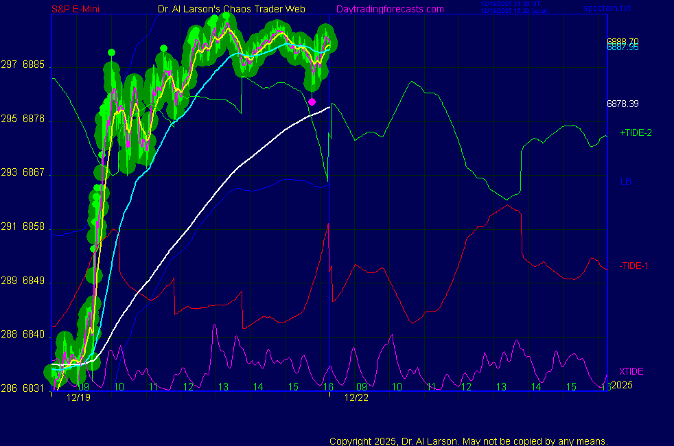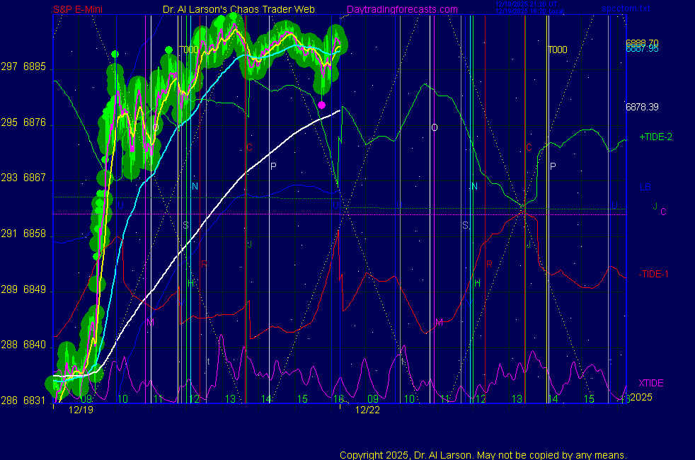 Today: CPI pop and drop as per Chart 3 on SPKISS page 10:25 440, 220, 110 up; buy 6840; stopped 6860 for +20 12:50 440, 220, 110 up; buy 6845; stopped 6855 for +10 Tomorrow: Moon conjoin Venus, trine Chiron, square Saturn **************************************************************************** during these volatile times, the point values in these instructions should multiplied by 5 ***************************************************************************** For trade times before 11:00, be sure to use EXMA's that include data from 8:15 Eastern Normal Rules ( as published on daytrading forecasts.com in the tutorial): These fit a Trend or Trend continuation scenario, identified by prices trading within a couple of points of the 110 minute EXMA, taking profits on a 12 point range. 1. Watch for the opportunity to go with the trend or change in trend at the time(s) given. Be alert for the turn coming early or late. Be patient and use the tracking indicators. Plan to trade in the direction of the 110 EXMA coming out of that time frame. Prices should stay on one side of the 110 EXMA and it should be moving, or curl up or down from a flat position. Prices should be within about 2 points of the 110 EXMA. The 20 minute EXMA should have crossed the 110 EXMA, or moved toward it and then pulled away from it. When this setup is clear, enter in the direction of the 110 EXMA with a 3 point stop. *** in volatile markets this may need to be 6 points If each setup is not clear 60 minutes after the given time, skip the trade. 2. Move the stop 1 point each 30 minutes. If the market moves decently, trail it by 3 points ( 6 points in volatile markets). 3. Cover on a 5 point gain**, 90 minutes after entry , at the next Tide turn , or if the prices clearly recross the 110 minute EXMA. ********************************************************************** **FAST MOVE RULE If the trade gains 3 points within 30 minutes of entry, press the stop, using the 20 EXMA as a guide to move the stop to the low or high of each pullback (normally about 15 minutes long) once the move makes a new high or low. Cover any gain of 9* points. *It is OK to use the fast stop rule if a trade starts fast, but to then cover at +5 or +4 if it slows or stalls *** Stall rule: Cover any trade that stalls for more than 45 minutes *** Carry through rule If you are in a trade that is working well, if is OK to carry through the next Tide turn *** GO BIG rule: if morning is a big move (>12 points ), and midday is a congestion or pullback, and the last trade of the day sets up near 2:00, a move greater than 9 points may be captured using the technique illustrated at http://moneytide.com/hans/cc09092008.asp *** VOLATILE MARKET RULE -use with discretion in volatile markets, the 55 minute EXMA used in place of the 110 minute EXMA may provide an earlier and lower risk entry. This is most useful when the market is extremely oversold or overbought and reversing, or during a fast move with minimal dips and one is looking to join the move. |