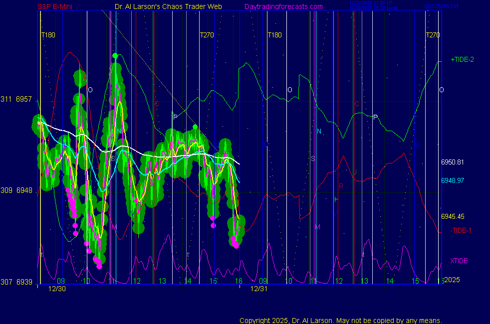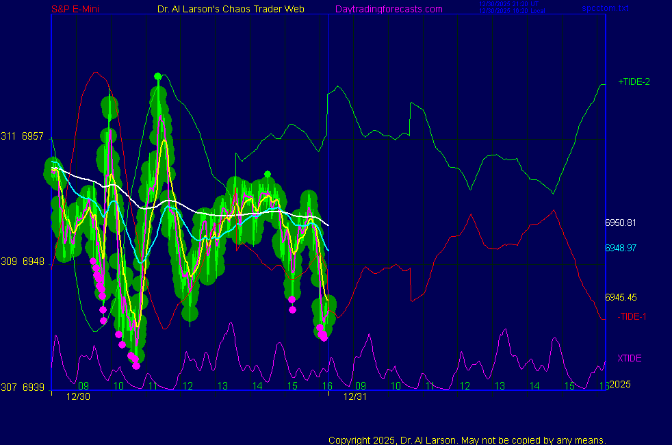 Today: as per chart 3 on the SPKISS page 09:55 440, 220, 110 down; sell 6955 carried through 12:21 , stopped 6943 for +12 14:40 440, 220, 110 up; buy 6954 stopped for +3 Tomorrow: Moon trine Mars, pentile Mercury **************************************************************************** during these volatile times, the point values in these instructions should multiplied by 5 ***************************************************************************** For trade times before 11:00, be sure to use EXMA's that include data from 8:15 Eastern Normal Rules ( as published on daytrading forecasts.com in the tutorial): These fit a Trend or Trend continuation scenario, identified by prices trading within a couple of points of the 110 minute EXMA, taking profits on a 12 point range. 1. Watch for the opportunity to go with the trend or change in trend at the time(s) given. Be alert for the turn coming early or late. Be patient and use the tracking indicators. Plan to trade in the direction of the 110 EXMA coming out of that time frame. Prices should stay on one side of the 110 EXMA and it should be moving, or curl up or down from a flat position. Prices should be within about 2 points of the 110 EXMA. The 20 minute EXMA should have crossed the 110 EXMA, or moved toward it and then pulled away from it. When this setup is clear, enter in the direction of the 110 EXMA with a 3 point stop. *** in volatile markets this may need to be 6 points If each setup is not clear 60 minutes after the given time, skip the trade. 2. Move the stop 1 point each 30 minutes. If the market moves decently, trail it by 3 points ( 6 points in volatile markets). 3. Cover on a 5 point gain**, 90 minutes after entry , at the next Tide turn , or if the prices clearly recross the 110 minute EXMA. ********************************************************************** **FAST MOVE RULE If the trade gains 3 points within 30 minutes of entry, press the stop, using the 20 EXMA as a guide to move the stop to the low or high of each pullback (normally about 15 minutes long) once the move makes a new high or low. Cover any gain of 9* points. *It is OK to use the fast stop rule if a trade starts fast, but to then cover at +5 or +4 if it slows or stalls *** Stall rule: Cover any trade that stalls for more than 45 minutes *** Carry through rule If you are in a trade that is working well, if is OK to carry through the next Tide turn *** GO BIG rule: if morning is a big move (>12 points ), and midday is a congestion or pullback, and the last trade of the day sets up near 2:00, a move greater than 9 points may be captured using the technique illustrated at http://moneytide.com/hans/cc09092008.asp *** VOLATILE MARKET RULE -use with discretion in volatile markets, the 55 minute EXMA used in place of the 110 minute EXMA may provide an earlier and lower risk entry. This is most useful when the market is extremely oversold or overbought and reversing, or during a fast move with minimal dips and one is looking to join the move. |