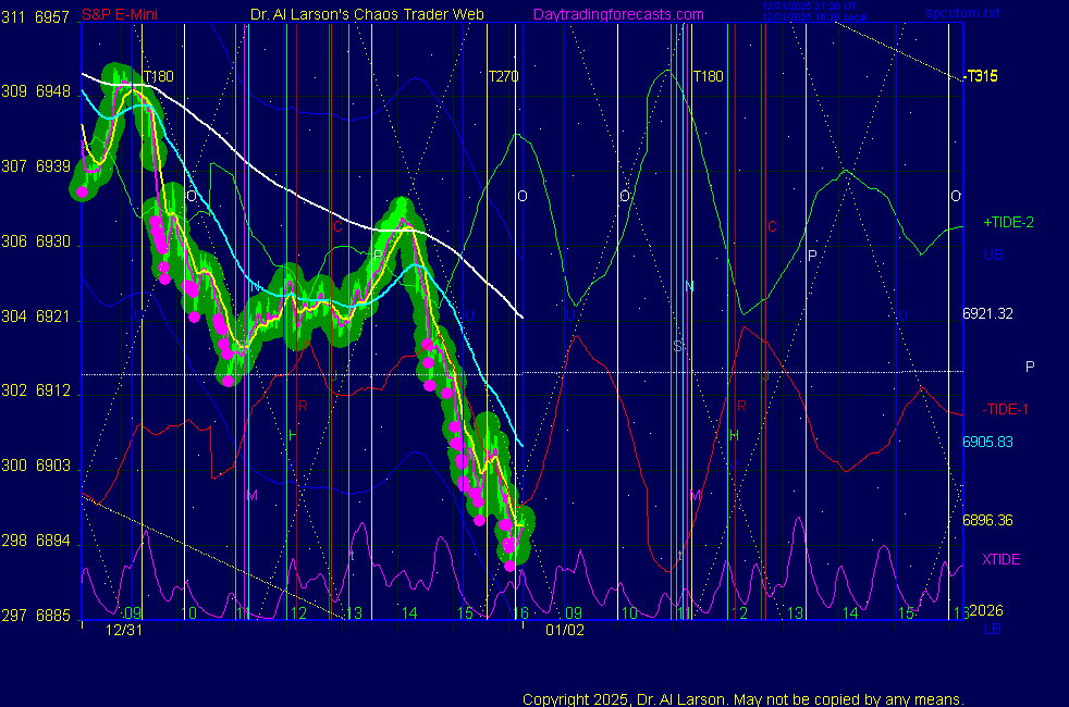 Today: as per chart 3 on the SPKISS page 09:38 440, 220, 110 down after spoke high; sold 6950; stopped 6948 for +2 13:37 440, 220, 110 flat-passed Tomorrow: Moon conjoin Uranus, octile Jupiter **************************************************************************** during these volatile times, the point values in these instructions should multiplied by 5 ***************************************************************************** For trade times before 11:00, be sure to use EXMA's that include data from 8:15 Eastern Normal Rules ( as published on daytrading forecasts.com in the tutorial): These fit a Trend or Trend continuation scenario, identified by prices trading within a couple of points of the 110 minute EXMA, taking profits on a 12 point range. 1. Watch for the opportunity to go with the trend or change in trend at the time(s) given. Be alert for the turn coming early or late. Be patient and use the tracking indicators. Plan to trade in the direction of the 110 EXMA coming out of that time frame. Prices should stay on one side of the 110 EXMA and it should be moving, or curl up or down from a flat position. Prices should be within about 2 points of the 110 EXMA. The 20 minute EXMA should have crossed the 110 EXMA, or moved toward it and then pulled away from it. When this setup is clear, enter in the direction of the 110 EXMA with a 3 point stop. *** in volatile markets this may need to be 6 points If each setup is not clear 60 minutes after the given time, skip the trade. 2. Move the stop 1 point each 30 minutes. If the market moves decently, trail it by 3 points ( 6 points in volatile markets). 3. Cover on a 5 point gain**, 90 minutes after entry , at the next Tide turn , or if the prices clearly recross the 110 minute EXMA. ********************************************************************** **FAST MOVE RULE If the trade gains 3 points within 30 minutes of entry, press the stop, using the 20 EXMA as a guide to move the stop to the low or high of each pullback (normally about 15 minutes long) once the move makes a new high or low. Cover any gain of 9* points. *It is OK to use the fast stop rule if a trade starts fast, but to then cover at +5 or +4 if it slows or stalls *** Stall rule: Cover any trade that stalls for more than 45 minutes *** Carry through rule If you are in a trade that is working well, if is OK to carry through the next Tide turn *** GO BIG rule: if morning is a big move (>12 points ), and midday is a congestion or pullback, and the last trade of the day sets up near 2:00, a move greater than 9 points may be captured using the technique illustrated at http://moneytide.com/hans/cc09092008.asp *** VOLATILE MARKET RULE -use with discretion in volatile markets, the 55 minute EXMA used in place of the 110 minute EXMA may provide an earlier and lower risk entry. This is most useful when the market is extremely oversold or overbought and reversing, or during a fast move with minimal dips and one is looking to join the move. |