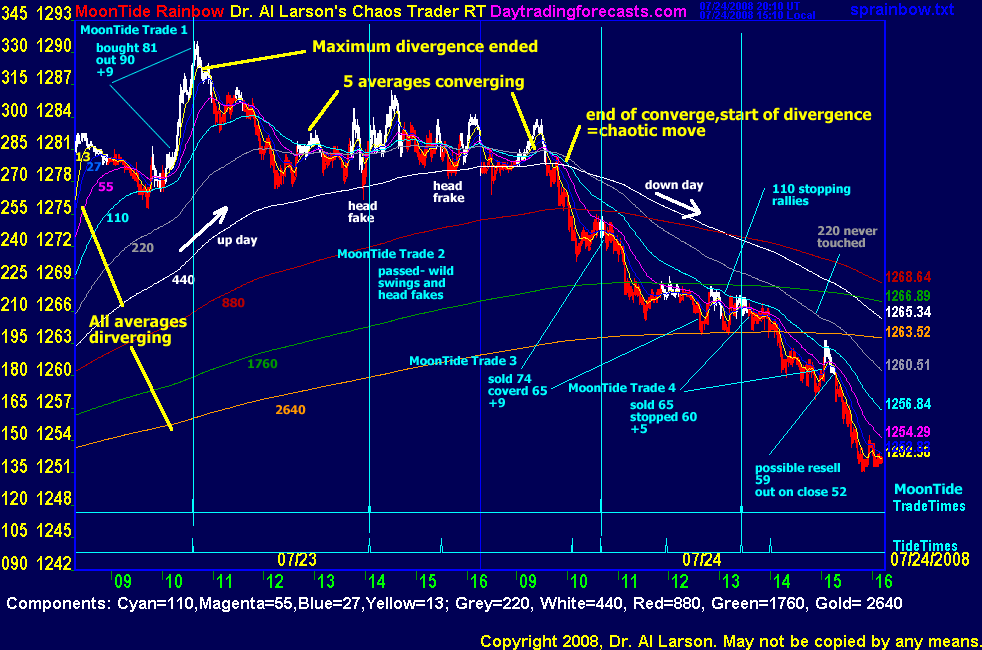 Trading the MoonTide RainbowJuly 24, 2008 God* has favored me with many blessings. This week He favored me with yet another insight-the exact time and price of the recent up fractal. This new insight, I was told, was not to be shared with the public. But I was told to share this page, as a passing on of my blessings to you. One of the charts I find very useful for judging the mood of the market is my MoonTide Rainbow chart. This chart displays a rainbow of moving averages that are tuned to the Moon's motion. The tuning starts with the 110 minute EXMA. A few students have teased out of me the fact that this sacred number is one degree of Moon motion. What I really like about this chart is that it lets me see the big picture, as opposed to just watching the events of the last 20 or 30 minutes. So it provides a trading context. From the 110 EXMA, additional moving averages are added by doubling and halving. There are two reasons for this. First, doubling and having is the basis of octaves in music. So this represents the harmonic nature of the energy being tracked. Second, in chaos theory , frequency doubling or halving is a precursor to chaos. So the rainbow helps pick up these shifts from a stable to a chaotic state. Gerald Appel picked up on this when he invented MACD - moving average converge divergence. And a rainbow of averages technique was published years ago in Stocks and Commodities. What is different here is using 8 octaves of averages, all tuned to Moon Harmonics. This chart shows the MoonTide Rainbow for July 23-24,2008. The rainbow lines are Cyan=110 minute EXMA=1 degree Moon motion, Magenta=55=1/2 degree, Blue=27=1/4 degree, Yellow=13=1/8th degree; Grey=220=2 degrees, White=440=4 degrees, Red=880=8 degrees, Green=1760=16 degrees , and Gold= 2640=24 degrees. The last one is not in the binary sequence, but is three times the 880. This is just an addition average that I have found useful. The white 440 is about 1/4th a day in time, or about the length of the trading day. So it tracks the trend of the day. Its slope is a good indicator of the emotional bias of the day. The 880 tracks the two trading day trend, and the 1760 the four day trend. The 1 minute bars are colored red or white, as the 13 and 27 minute averages cross. This is useful for finding entry and exit points. They should be taken as entries only in the direction indicated by the 110 and 220 averages. The chart I use is a two day chart, including the NYSE outcry session from 9:30 to 4:15 Eastern, and 1:15 before the outcry session- i.e., from 8:15-4:15 Eastern. This surgically tunes the chart to the 8 hour period ( third harmonic of the day) in which the most volume occurs.