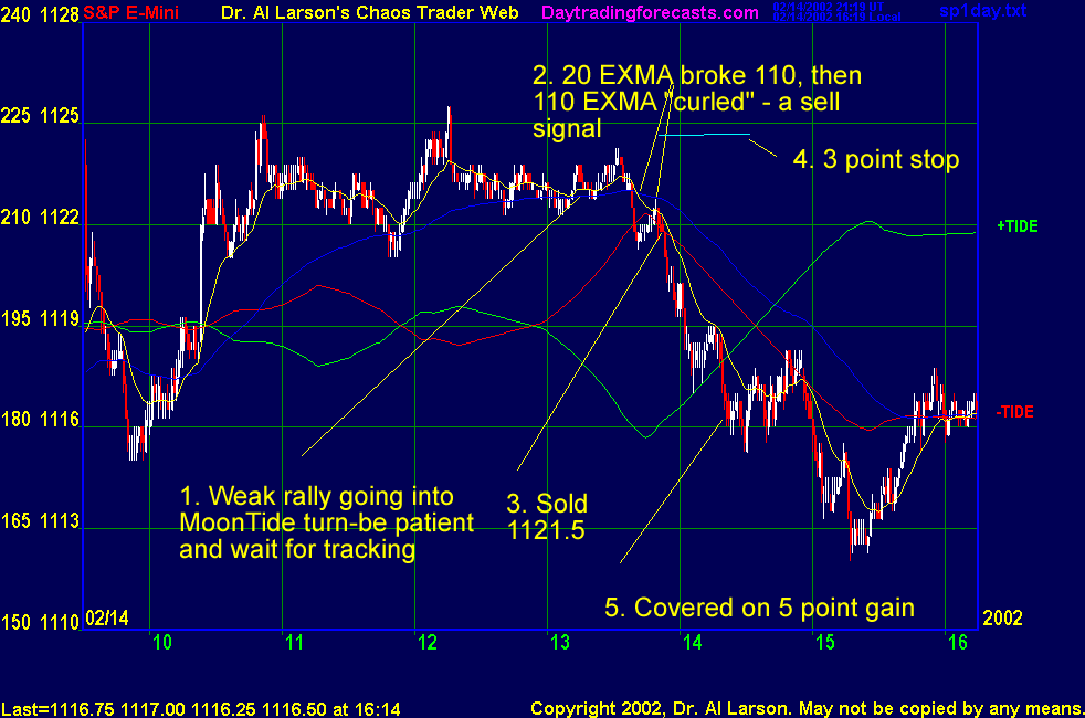 On this one, the setup was not quite as anticipated, so I watched, afraid that the MoonTide turn had washed out. Then the market broke, the 20 EXMA crossed the 110 EXMA, and the 110 curled over sharply. This all confirmed the turn, so to me, the trade was on. The only other choice was to skip the trade, which is also OK, since it cost nothing and tomorrow is another day. This trade was a nice one. I love it when the Tides work like this. Forecast, Plan, Track, Trade.