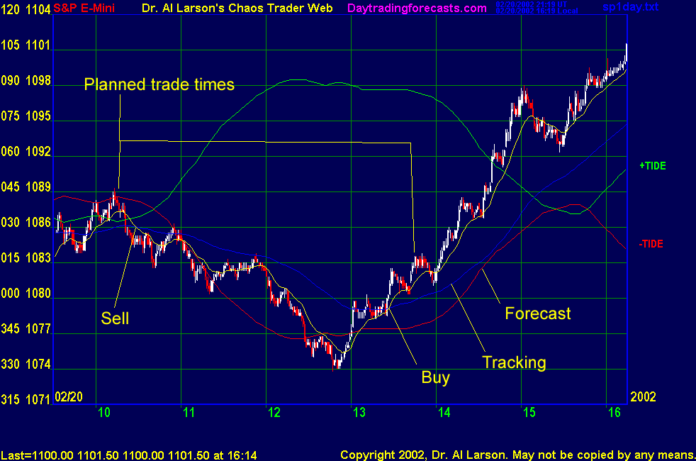 Notice the blue 110 minute EXMA, and the red -MoonTide. That's a pretty splendid forecast. Then notice the yellow 20 minute EXMA. It crossed the blue 110 at 10:30, giving a sell signal, with price at 1084.50. Then it gave a buy at 1:30, near 1081. So the two tracking indicators confirmed the two tradable turns in the MoonTide forecast. And the afternoon rally stayed above the 110 EXMA into the close. So it was a great combination of a forecast, and the two tracking indicators making trading both easy and profitable. The 1ADay had a quantum price of 1089, putting the sell stop at 1086, which was hit. The trailing stop was 1089, moving down 1 point every 30 minutes. Just before the 12:20 timeout, price hit 1080, for a 6 point gain. Again, a good forecast, good planning, and good tracking made for good trading. Love them MoonTides.