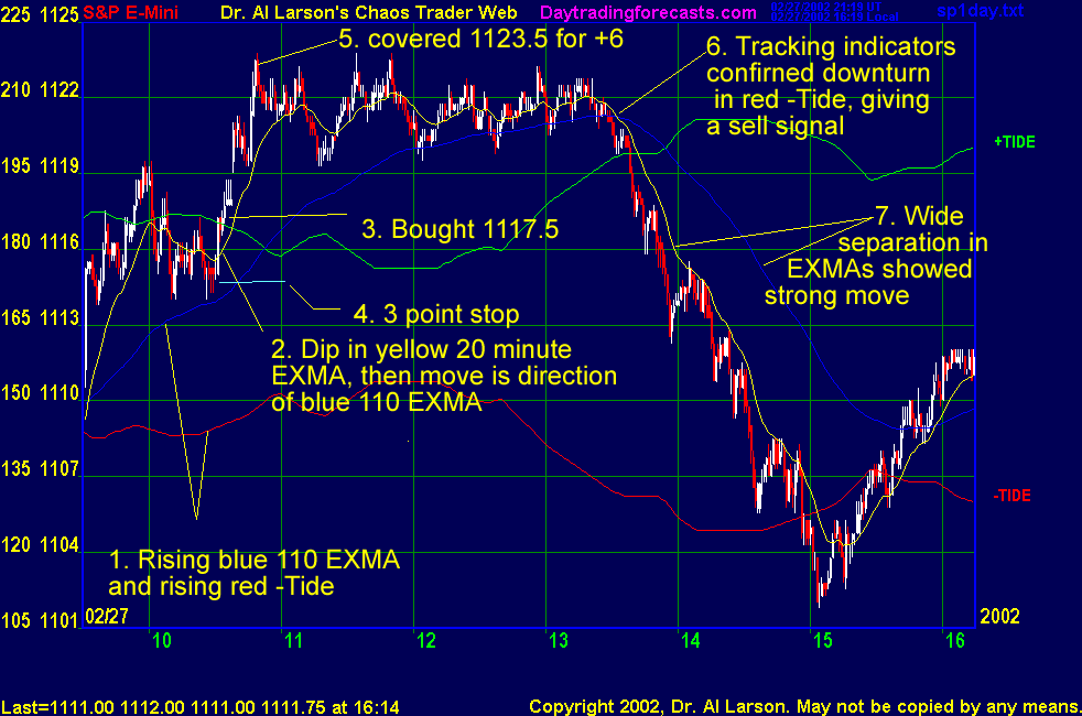 This setup was almost exactly as outlined, and looks easy in hindsight. The second turn near 12:00 developed slowly, as people waited for Greenspan to say he would rescue them. So the red -Tide shifted right about an hour. But our 110/20 tracking system showed us where the turn was, and a trade make off it was even better than the 1ADay.