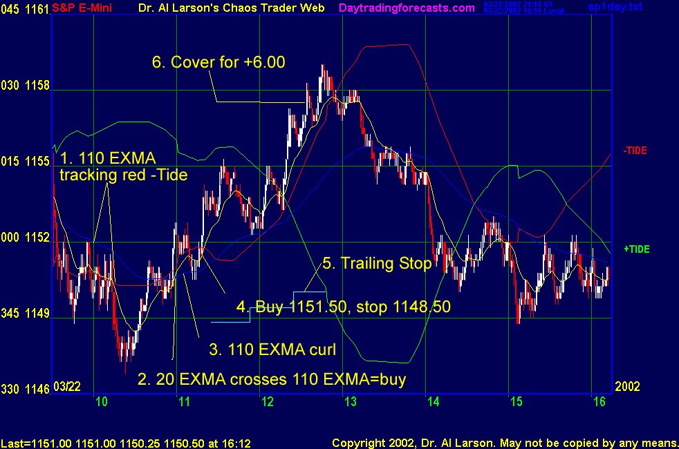 Today's email said: Tides show a slow start to the day, probably chopping in the congestion zone- then prices start to move between 10:30 and 11:30. They stall 1:10-1:50, then move again, with a late countermove. Strategy: Go with the trend coming out of the 10:30-11:30 timezone 1. Watch for the opportunity to go with the trend coming out of the 10:30-11:30 timezone. Be alert for the turn coming early or late. Be patient and use the tracking indicators. Plan to trade in the direction of the 110 EXMA coming out of that time frame. Prices should stay on one side of the 110 EXMA and it should be moving, or curl up or down from a flat position. Prices should be within about 2 points of the 110 EXMA. The 20 minute EXMA should have crossed the 110 EXMA, or dipped toward it and then pulled away from it. When this setup is clear, enter in the direction of the 110 EXMA with a 3 point stop. If this setup is not clear by 12:15, skip the trade. 2. Move the stop 1 point each 30 minutes. 3. Cover on a 6 point gain, at 1:00, or if the range reaches 17 points, or if the 20 EXMA recrosses the 110 minute EXMA. The chart is annotated with the events as they unfolded in real time.