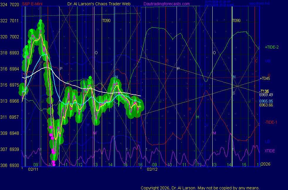 Today: as per chart 3 of SPKISS page 09:31 440, 220, 110 up; buy 6993; stopped for -3 12:54 440,220,110 down; sell 6985; covered 6960 for +25 Tomorrow: Moon pentile Venus (1st) and Jupiter (3rd) **************************************************************************** during these volatile times, the point values in these instructions should multiplied by 5 ***************************************************************************** For trade times before 11:00, be sure to use EXMA's that include data from 8:15 Eastern Normal Rules ( as published on daytrading forecasts.com in the tutorial): These fit a Trend or Trend continuation scenario, identified by prices trading within a couple of points of the 110 minute EXMA, taking profits on a 12 point range. 1. Watch for the opportunity to go with the trend or change in trend at the time(s) given. Be alert for the turn coming early or late. Be patient and use the tracking indicators. Plan to trade in the direction of the 110 EXMA coming out of that time frame. Prices should stay on one side of the 110 EXMA and it should be moving, or curl up or down from a flat position. Prices should be within about 2 points of the 110 EXMA. The 20 minute EXMA should have crossed the 110 EXMA, or moved toward it and then pulled away from it. When this setup is clear, enter in the direction of the 110 EXMA with a 3 point stop. *** in volatile markets this may need to be 6 points If each setup is not clear 60 minutes after the given time, skip the trade. 2. Move the stop 1 point each 30 minutes. If the market moves decently, trail it by 3 points ( 6 points in volatile markets). 3. Cover on a 5 point gain**, 90 minutes after entry , at the next Tide turn , or if the prices clearly recross the 110 minute EXMA. ********************************************************************** **FAST MOVE RULE If the trade gains 3 points within 30 minutes of entry, press the stop, using the 20 EXMA as a guide to move the stop to the low or high of each pullback (normally about 15 minutes long) once the move makes a new high or low. Cover any gain of 9* points. *It is OK to use the fast stop rule if a trade starts fast, but to then cover at +5 or +4 if it slows or stalls *** Stall rule: Cover any trade that stalls for more than 45 minutes *** Carry through rule If you are in a trade that is working well, if is OK to carry through the next Tide turn *** GO BIG rule: if morning is a big move (>12 points ), and midday is a congestion or pullback, and the last trade of the day sets up near 2:00, a move greater than 9 points may be captured using the technique illustrated at http://moneytide.com/hans/cc09092008.asp *** VOLATILE MARKET RULE -use with discretion in volatile markets, the 55 minute EXMA used in place of the 110 minute EXMA may provide an earlier and lower risk entry. This is most useful when the market is extremely oversold or overbought and reversing, or during a fast move with minimal dips and one is looking to join the move. |