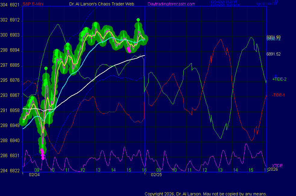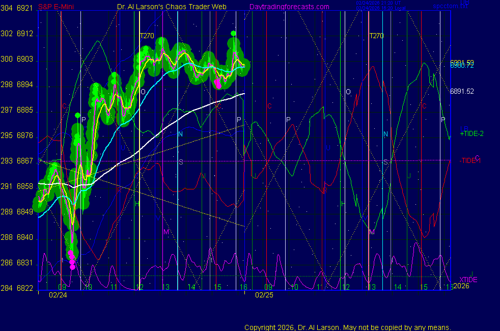 Today: as per chart 3 on SPKISS page 10:27 440, 220, 110 down; sell 6890 carried through 11:50 stopped 6845 for +45 14:06 440, 220, 110 down; sell 6848 stopped for +6 Tomorrow: Moon square Node, octile Chiron **************************************************************************** during these volatile times, the point values in these instructions should multiplied by 5 ***************************************************************************** For trade times before 11:00, be sure to use EXMA's that include data from 8:15 Eastern Normal Rules ( as published on daytrading forecasts.com in the tutorial): These fit a Trend or Trend continuation scenario, identified by prices trading within a couple of points of the 110 minute EXMA, taking profits on a 12 point range. 1. Watch for the opportunity to go with the trend or change in trend at the time(s) given. Be alert for the turn coming early or late. Be patient and use the tracking indicators. Plan to trade in the direction of the 110 EXMA coming out of that time frame. Prices should stay on one side of the 110 EXMA and it should be moving, or curl up or down from a flat position. Prices should be within about 2 points of the 110 EXMA. The 20 minute EXMA should have crossed the 110 EXMA, or moved toward it and then pulled away from it. When this setup is clear, enter in the direction of the 110 EXMA with a 3 point stop. *** in volatile markets this may need to be 6 points If each setup is not clear 60 minutes after the given time, skip the trade. 2. Move the stop 1 point each 30 minutes. If the market moves decently, trail it by 3 points ( 6 points in volatile markets). 3. Cover on a 5 point gain**, 90 minutes after entry , at the next Tide turn , or if the prices clearly recross the 110 minute EXMA. ********************************************************************** **FAST MOVE RULE If the trade gains 3 points within 30 minutes of entry, press the stop, using the 20 EXMA as a guide to move the stop to the low or high of each pullback (normally about 15 minutes long) once the move makes a new high or low. Cover any gain of 9* points. *It is OK to use the fast stop rule if a trade starts fast, but to then cover at +5 or +4 if it slows or stalls *** Stall rule: Cover any trade that stalls for more than 45 minutes *** Carry through rule If you are in a trade that is working well, if is OK to carry through the next Tide turn *** GO BIG rule: if morning is a big move (>12 points ), and midday is a congestion or pullback, and the last trade of the day sets up near 2:00, a move greater than 9 points may be captured using the technique illustrated at http://moneytide.com/hans/cc09092008.asp *** VOLATILE MARKET RULE -use with discretion in volatile markets, the 55 minute EXMA used in place of the 110 minute EXMA may provide an earlier and lower risk entry. This is most useful when the market is extremely oversold or overbought and reversing, or during a fast move with minimal dips and one is looking to join the move. |