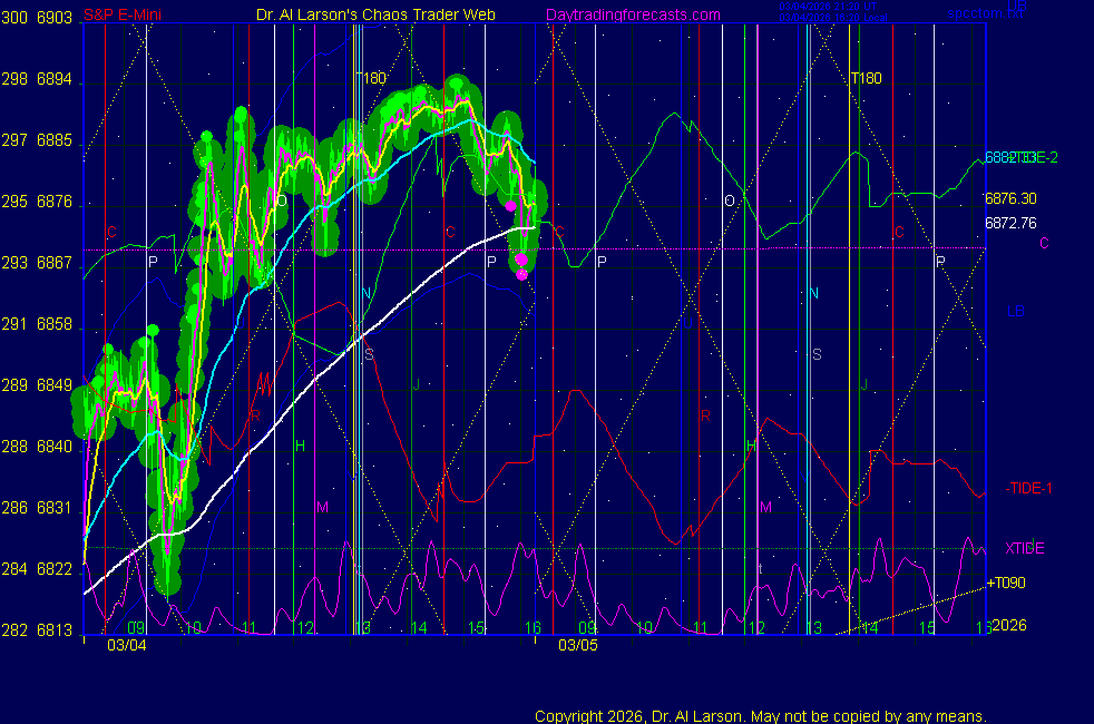 Today: as per chart 3 of SPKISS page chart 1 was good too 09:31 440,220,110 down; sell 6760 stopped 6741 for +19 13:16 440, 220, 110 up; buy 6813 stopped 6831 for +18 Tomorrow: Moon oppose Saturn/Neptune/Venus **************************************************************************** during these volatile times, the point values in these instructions should multiplied by 5 ***************************************************************************** For trade times before 11:00, be sure to use EXMA's that include data from 8:15 Eastern Normal Rules ( as published on daytrading forecasts.com in the tutorial): These fit a Trend or Trend continuation scenario, identified by prices trading within a couple of points of the 110 minute EXMA, taking profits on a 12 point range. 1. Watch for the opportunity to go with the trend or change in trend at the time(s) given. Be alert for the turn coming early or late. Be patient and use the tracking indicators. Plan to trade in the direction of the 110 EXMA coming out of that time frame. Prices should stay on one side of the 110 EXMA and it should be moving, or curl up or down from a flat position. Prices should be within about 2 points of the 110 EXMA. The 20 minute EXMA should have crossed the 110 EXMA, or moved toward it and then pulled away from it. When this setup is clear, enter in the direction of the 110 EXMA with a 3 point stop. *** in volatile markets this may need to be 6 points If each setup is not clear 60 minutes after the given time, skip the trade. 2. Move the stop 1 point each 30 minutes. If the market moves decently, trail it by 3 points ( 6 points in volatile markets). 3. Cover on a 5 point gain**, 90 minutes after entry , at the next Tide turn , or if the prices clearly recross the 110 minute EXMA. ********************************************************************** **FAST MOVE RULE If the trade gains 3 points within 30 minutes of entry, press the stop, using the 20 EXMA as a guide to move the stop to the low or high of each pullback (normally about 15 minutes long) once the move makes a new high or low. Cover any gain of 9* points. *It is OK to use the fast stop rule if a trade starts fast, but to then cover at +5 or +4 if it slows or stalls *** Stall rule: Cover any trade that stalls for more than 45 minutes *** Carry through rule If you are in a trade that is working well, if is OK to carry through the next Tide turn *** GO BIG rule: if morning is a big move (>12 points ), and midday is a congestion or pullback, and the last trade of the day sets up near 2:00, a move greater than 9 points may be captured using the technique illustrated at http://moneytide.com/hans/cc09092008.asp *** VOLATILE MARKET RULE -use with discretion in volatile markets, the 55 minute EXMA used in place of the 110 minute EXMA may provide an earlier and lower risk entry. This is most useful when the market is extremely oversold or overbought and reversing, or during a fast move with minimal dips and one is looking to join the move. |