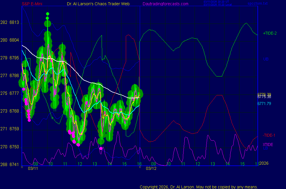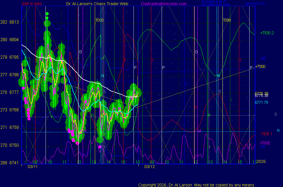 Today: as per chart 3 on SPKISS page 09:51 440 and 220 up, 110 dipped, then up; bought 6772 stopped 6825 for +53 13:46 20, then 110, the 220 turned down; sold 6920 stopped 6995 for +25 Tomorrow: Moon square Neptune **************************************************************************** during these volatile times, the point values in these instructions should multiplied by 5 ***************************************************************************** For trade times before 11:00, be sure to use EXMA's that include data from 8:15 Eastern Normal Rules ( as published on daytrading forecasts.com in the tutorial): These fit a Trend or Trend continuation scenario, identified by prices trading within a couple of points of the 110 minute EXMA, taking profits on a 12 point range. 1. Watch for the opportunity to go with the trend or change in trend at the time(s) given. Be alert for the turn coming early or late. Be patient and use the tracking indicators. Plan to trade in the direction of the 110 EXMA coming out of that time frame. Prices should stay on one side of the 110 EXMA and it should be moving, or curl up or down from a flat position. Prices should be within about 2 points of the 110 EXMA. The 20 minute EXMA should have crossed the 110 EXMA, or moved toward it and then pulled away from it. When this setup is clear, enter in the direction of the 110 EXMA with a 3 point stop. *** in volatile markets this may need to be 6 points If each setup is not clear 60 minutes after the given time, skip the trade. 2. Move the stop 1 point each 30 minutes. If the market moves decently, trail it by 3 points ( 6 points in volatile markets). 3. Cover on a 5 point gain**, 90 minutes after entry , at the next Tide turn , or if the prices clearly recross the 110 minute EXMA. ********************************************************************** **FAST MOVE RULE If the trade gains 3 points within 30 minutes of entry, press the stop, using the 20 EXMA as a guide to move the stop to the low or high of each pullback (normally about 15 minutes long) once the move makes a new high or low. Cover any gain of 9* points. *It is OK to use the fast stop rule if a trade starts fast, but to then cover at +5 or +4 if it slows or stalls *** Stall rule: Cover any trade that stalls for more than 45 minutes *** Carry through rule If you are in a trade that is working well, if is OK to carry through the next Tide turn *** GO BIG rule: if morning is a big move (>12 points ), and midday is a congestion or pullback, and the last trade of the day sets up near 2:00, a move greater than 9 points may be captured using the technique illustrated at http://moneytide.com/hans/cc09092008.asp *** VOLATILE MARKET RULE -use with discretion in volatile markets, the 55 minute EXMA used in place of the 110 minute EXMA may provide an earlier and lower risk entry. This is most useful when the market is extremely oversold or overbought and reversing, or during a fast move with minimal dips and one is looking to join the move. |