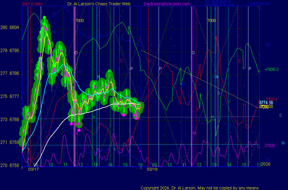 Today: as per chart 3 on SPKISS due to an error charts today were still on March contract tomorrow they should be on June contract 09:31 440, 220, 110 up; bought 6705 stopped 6716 for +11 12:13 440 up, 110 down - passed Tomorrow: Moon conjoin Mercury, Mars, Node **************************************************************************** during these volatile times, the point values in these instructions should multiplied by 5 ***************************************************************************** For trade times before 11:00, be sure to use EXMA's that include data from 8:15 Eastern Normal Rules ( as published on daytrading forecasts.com in the tutorial): These fit a Trend or Trend continuation scenario, identified by prices trading within a couple of points of the 110 minute EXMA, taking profits on a 12 point range. 1. Watch for the opportunity to go with the trend or change in trend at the time(s) given. Be alert for the turn coming early or late. Be patient and use the tracking indicators. Plan to trade in the direction of the 110 EXMA coming out of that time frame. Prices should stay on one side of the 110 EXMA and it should be moving, or curl up or down from a flat position. Prices should be within about 2 points of the 110 EXMA. The 20 minute EXMA should have crossed the 110 EXMA, or moved toward it and then pulled away from it. When this setup is clear, enter in the direction of the 110 EXMA with a 3 point stop. *** in volatile markets this may need to be 6 points If each setup is not clear 60 minutes after the given time, skip the trade. 2. Move the stop 1 point each 30 minutes. If the market moves decently, trail it by 3 points ( 6 points in volatile markets). 3. Cover on a 5 point gain**, 90 minutes after entry , at the next Tide turn , or if the prices clearly recross the 110 minute EXMA. ********************************************************************** **FAST MOVE RULE If the trade gains 3 points within 30 minutes of entry, press the stop, using the 20 EXMA as a guide to move the stop to the low or high of each pullback (normally about 15 minutes long) once the move makes a new high or low. Cover any gain of 9* points. *It is OK to use the fast stop rule if a trade starts fast, but to then cover at +5 or +4 if it slows or stalls *** Stall rule: Cover any trade that stalls for more than 45 minutes *** Carry through rule If you are in a trade that is working well, if is OK to carry through the next Tide turn *** GO BIG rule: if morning is a big move (>12 points ), and midday is a congestion or pullback, and the last trade of the day sets up near 2:00, a move greater than 9 points may be captured using the technique illustrated at http://moneytide.com/hans/cc09092008.asp *** VOLATILE MARKET RULE -use with discretion in volatile markets, the 55 minute EXMA used in place of the 110 minute EXMA may provide an earlier and lower risk entry. This is most useful when the market is extremely oversold or overbought and reversing, or during a fast move with minimal dips and one is looking to join the move. |