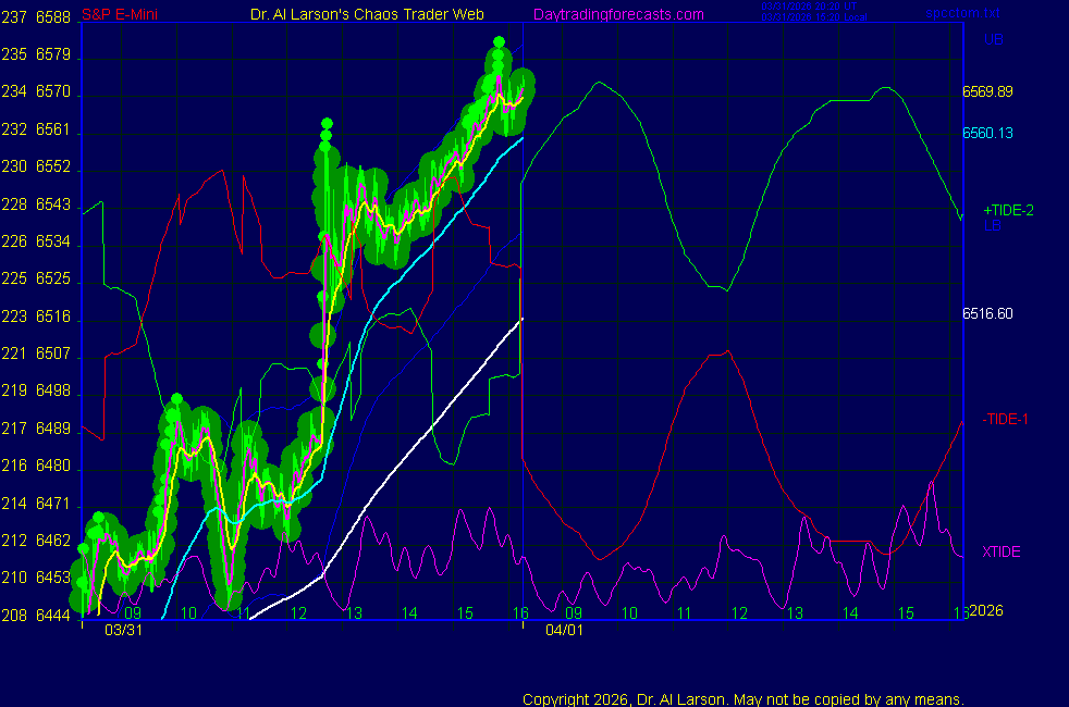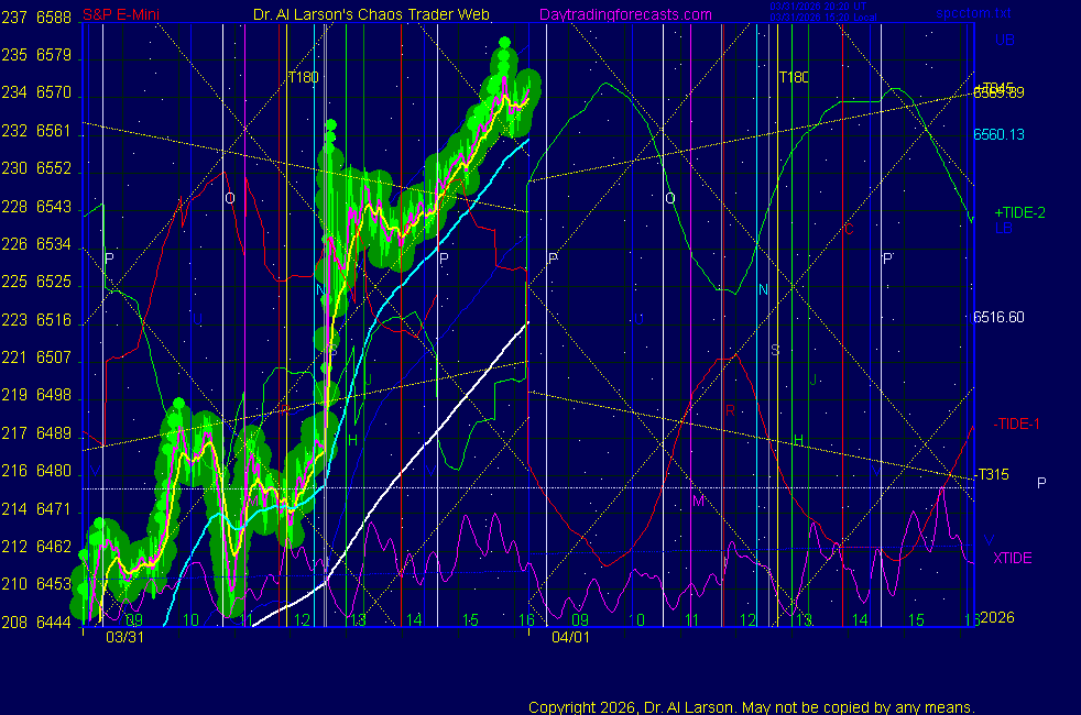 Today: as per chart 3 on SPKISS page 10:15 440, 220, 110 down; sell 6435 stopped for +2 12:08 440, 220, 110 down; sell 6430 carried through 14:11 covered 6363 for +67 Tomorrow: Moon oppose Mars ( 11:55 ) **************************************************************************** during these volatile times, the point values in these instructions should multiplied by 5 ***************************************************************************** For trade times before 11:00, be sure to use EXMA's that include data from 8:15 Eastern Normal Rules ( as published on daytrading forecasts.com in the tutorial): These fit a Trend or Trend continuation scenario, identified by prices trading within a couple of points of the 110 minute EXMA, taking profits on a 12 point range. 1. Watch for the opportunity to go with the trend or change in trend at the time(s) given. Be alert for the turn coming early or late. Be patient and use the tracking indicators. Plan to trade in the direction of the 110 EXMA coming out of that time frame. Prices should stay on one side of the 110 EXMA and it should be moving, or curl up or down from a flat position. Prices should be within about 2 points of the 110 EXMA. The 20 minute EXMA should have crossed the 110 EXMA, or moved toward it and then pulled away from it. When this setup is clear, enter in the direction of the 110 EXMA with a 3 point stop. *** in volatile markets this may need to be 6 points If each setup is not clear 60 minutes after the given time, skip the trade. 2. Move the stop 1 point each 30 minutes. If the market moves decently, trail it by 3 points ( 6 points in volatile markets). 3. Cover on a 5 point gain**, 90 minutes after entry , at the next Tide turn , or if the prices clearly recross the 110 minute EXMA. ********************************************************************** **FAST MOVE RULE If the trade gains 3 points within 30 minutes of entry, press the stop, using the 20 EXMA as a guide to move the stop to the low or high of each pullback (normally about 15 minutes long) once the move makes a new high or low. Cover any gain of 9* points. *It is OK to use the fast stop rule if a trade starts fast, but to then cover at +5 or +4 if it slows or stalls *** Stall rule: Cover any trade that stalls for more than 45 minutes *** Carry through rule If you are in a trade that is working well, if is OK to carry through the next Tide turn *** GO BIG rule: if morning is a big move (>12 points ), and midday is a congestion or pullback, and the last trade of the day sets up near 2:00, a move greater than 9 points may be captured using the technique illustrated at http://moneytide.com/hans/cc09092008.asp *** VOLATILE MARKET RULE -use with discretion in volatile markets, the 55 minute EXMA used in place of the 110 minute EXMA may provide an earlier and lower risk entry. This is most useful when the market is extremely oversold or overbought and reversing, or during a fast move with minimal dips and one is looking to join the move. |