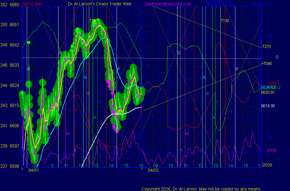 Today: as per chart 3 on SPKISS page 10:51 440, 220, 110 up; bought 6473 exploded passing Moon oppose Mars ( 11:55 ) stopped 6543 for +70 13:12 440, 220, 110 up; bought 6544 carried through 14:59; covered 6574 for +30 Tomorrow: Moon oppose Saturn, square Jupiter **************************************************************************** during these volatile times, the point values in these instructions should multiplied by 5 ***************************************************************************** For trade times before 11:00, be sure to use EXMA's that include data from 8:15 Eastern Normal Rules ( as published on daytrading forecasts.com in the tutorial): These fit a Trend or Trend continuation scenario, identified by prices trading within a couple of points of the 110 minute EXMA, taking profits on a 12 point range. 1. Watch for the opportunity to go with the trend or change in trend at the time(s) given. Be alert for the turn coming early or late. Be patient and use the tracking indicators. Plan to trade in the direction of the 110 EXMA coming out of that time frame. Prices should stay on one side of the 110 EXMA and it should be moving, or curl up or down from a flat position. Prices should be within about 2 points of the 110 EXMA. The 20 minute EXMA should have crossed the 110 EXMA, or moved toward it and then pulled away from it. When this setup is clear, enter in the direction of the 110 EXMA with a 3 point stop. *** in volatile markets this may need to be 6 points If each setup is not clear 60 minutes after the given time, skip the trade. 2. Move the stop 1 point each 30 minutes. If the market moves decently, trail it by 3 points ( 6 points in volatile markets). 3. Cover on a 5 point gain**, 90 minutes after entry , at the next Tide turn , or if the prices clearly recross the 110 minute EXMA. ********************************************************************** **FAST MOVE RULE If the trade gains 3 points within 30 minutes of entry, press the stop, using the 20 EXMA as a guide to move the stop to the low or high of each pullback (normally about 15 minutes long) once the move makes a new high or low. Cover any gain of 9* points. *It is OK to use the fast stop rule if a trade starts fast, but to then cover at +5 or +4 if it slows or stalls *** Stall rule: Cover any trade that stalls for more than 45 minutes *** Carry through rule If you are in a trade that is working well, if is OK to carry through the next Tide turn *** GO BIG rule: if morning is a big move (>12 points ), and midday is a congestion or pullback, and the last trade of the day sets up near 2:00, a move greater than 9 points may be captured using the technique illustrated at http://moneytide.com/hans/cc09092008.asp *** VOLATILE MARKET RULE -use with discretion in volatile markets, the 55 minute EXMA used in place of the 110 minute EXMA may provide an earlier and lower risk entry. This is most useful when the market is extremely oversold or overbought and reversing, or during a fast move with minimal dips and one is looking to join the move. |