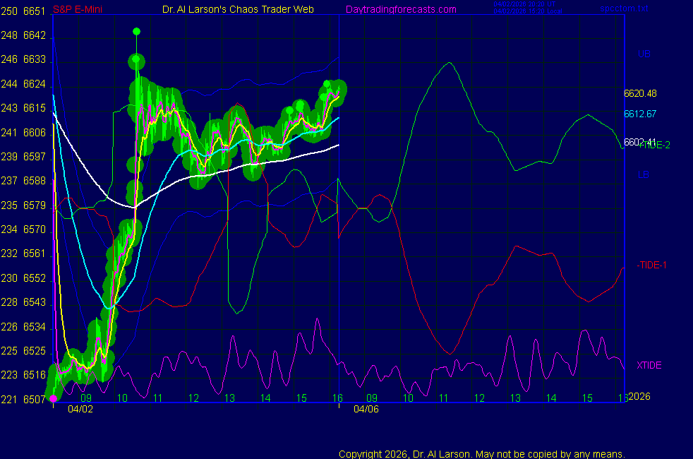 Today: as per chart 3 on SPKISS page 09:41 440,220,110 up; bought 6610 carried through 12:02 covered 6651 for +41 14:50 440, 220, 110 turned down; sold 5440 stopped 6615 for +25 Tomorrow: Moon square Jupiter, oppose Chiron **************************************************************************** during these volatile times, the point values in these instructions should multiplied by 5 ***************************************************************************** For trade times before 11:00, be sure to use EXMA's that include data from 8:15 Eastern Normal Rules ( as published on daytrading forecasts.com in the tutorial): These fit a Trend or Trend continuation scenario, identified by prices trading within a couple of points of the 110 minute EXMA, taking profits on a 12 point range. 1. Watch for the opportunity to go with the trend or change in trend at the time(s) given. Be alert for the turn coming early or late. Be patient and use the tracking indicators. Plan to trade in the direction of the 110 EXMA coming out of that time frame. Prices should stay on one side of the 110 EXMA and it should be moving, or curl up or down from a flat position. Prices should be within about 2 points of the 110 EXMA. The 20 minute EXMA should have crossed the 110 EXMA, or moved toward it and then pulled away from it. When this setup is clear, enter in the direction of the 110 EXMA with a 3 point stop. *** in volatile markets this may need to be 6 points If each setup is not clear 60 minutes after the given time, skip the trade. 2. Move the stop 1 point each 30 minutes. If the market moves decently, trail it by 3 points ( 6 points in volatile markets). 3. Cover on a 5 point gain**, 90 minutes after entry , at the next Tide turn , or if the prices clearly recross the 110 minute EXMA. ********************************************************************** **FAST MOVE RULE If the trade gains 3 points within 30 minutes of entry, press the stop, using the 20 EXMA as a guide to move the stop to the low or high of each pullback (normally about 15 minutes long) once the move makes a new high or low. Cover any gain of 9* points. *It is OK to use the fast stop rule if a trade starts fast, but to then cover at +5 or +4 if it slows or stalls *** Stall rule: Cover any trade that stalls for more than 45 minutes *** Carry through rule If you are in a trade that is working well, if is OK to carry through the next Tide turn *** GO BIG rule: if morning is a big move (>12 points ), and midday is a congestion or pullback, and the last trade of the day sets up near 2:00, a move greater than 9 points may be captured using the technique illustrated at http://moneytide.com/hans/cc09092008.asp *** VOLATILE MARKET RULE -use with discretion in volatile markets, the 55 minute EXMA used in place of the 110 minute EXMA may provide an earlier and lower risk entry. This is most useful when the market is extremely oversold or overbought and reversing, or during a fast move with minimal dips and one is looking to join the move. |
