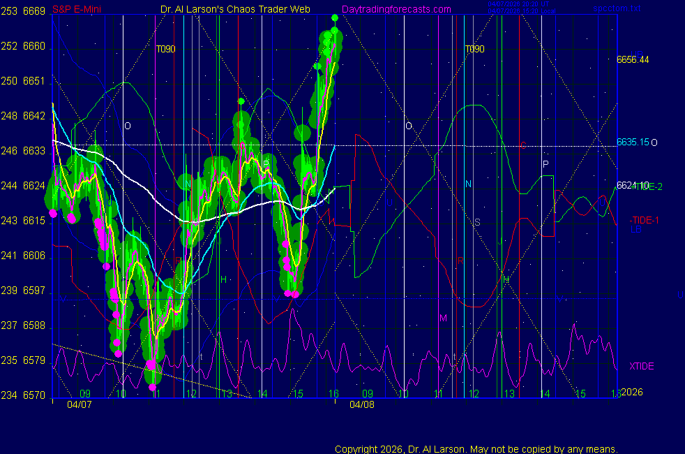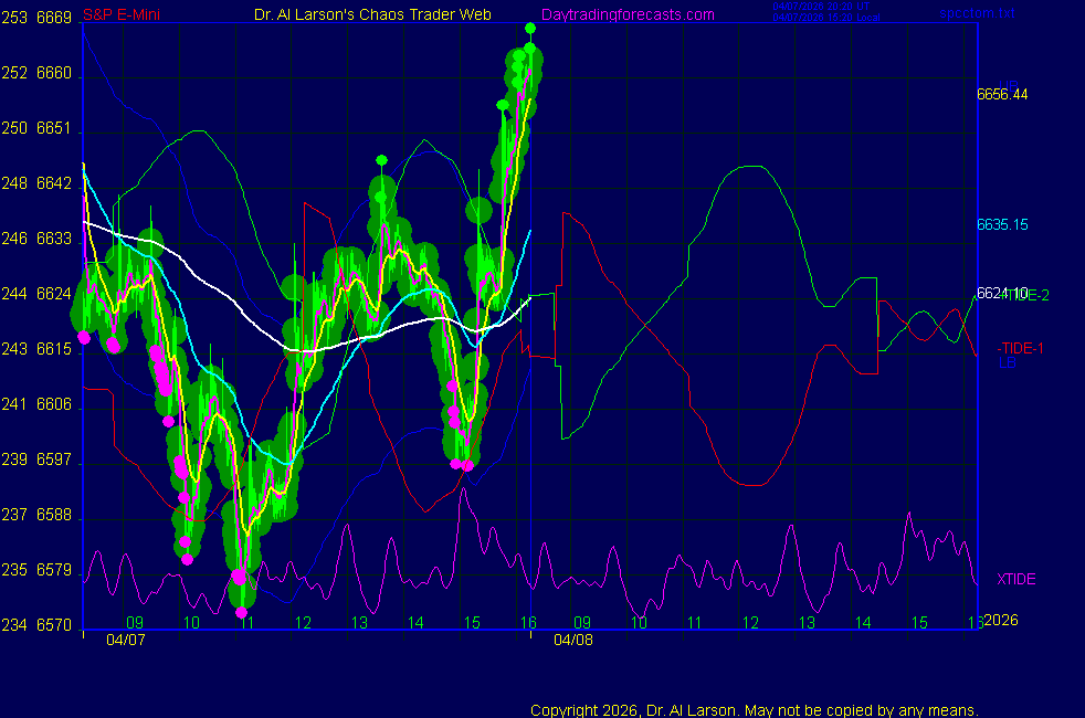 Today: as per chart 3 on SPKISS page 09:31 440, 220, 110 up; buy 6642 stopped for +4 13:15 440, 220, 110 down; sell 6630 stopped for 0 Tomorrow: Moon square Mercury **************************************************************************** during these volatile times, the point values in these instructions should multiplied by 5 ***************************************************************************** For trade times before 11:00, be sure to use EXMA's that include data from 8:15 Eastern Normal Rules ( as published on daytrading forecasts.com in the tutorial): These fit a Trend or Trend continuation scenario, identified by prices trading within a couple of points of the 110 minute EXMA, taking profits on a 12 point range. 1. Watch for the opportunity to go with the trend or change in trend at the time(s) given. Be alert for the turn coming early or late. Be patient and use the tracking indicators. Plan to trade in the direction of the 110 EXMA coming out of that time frame. Prices should stay on one side of the 110 EXMA and it should be moving, or curl up or down from a flat position. Prices should be within about 2 points of the 110 EXMA. The 20 minute EXMA should have crossed the 110 EXMA, or moved toward it and then pulled away from it. When this setup is clear, enter in the direction of the 110 EXMA with a 3 point stop. *** in volatile markets this may need to be 6 points If each setup is not clear 60 minutes after the given time, skip the trade. 2. Move the stop 1 point each 30 minutes. If the market moves decently, trail it by 3 points ( 6 points in volatile markets). 3. Cover on a 5 point gain**, 90 minutes after entry , at the next Tide turn , or if the prices clearly recross the 110 minute EXMA. ********************************************************************** **FAST MOVE RULE If the trade gains 3 points within 30 minutes of entry, press the stop, using the 20 EXMA as a guide to move the stop to the low or high of each pullback (normally about 15 minutes long) once the move makes a new high or low. Cover any gain of 9* points. *It is OK to use the fast stop rule if a trade starts fast, but to then cover at +5 or +4 if it slows or stalls *** Stall rule: Cover any trade that stalls for more than 45 minutes *** Carry through rule If you are in a trade that is working well, if is OK to carry through the next Tide turn *** GO BIG rule: if morning is a big move (>12 points ), and midday is a congestion or pullback, and the last trade of the day sets up near 2:00, a move greater than 9 points may be captured using the technique illustrated at http://moneytide.com/hans/cc09092008.asp *** VOLATILE MARKET RULE -use with discretion in volatile markets, the 55 minute EXMA used in place of the 110 minute EXMA may provide an earlier and lower risk entry. This is most useful when the market is extremely oversold or overbought and reversing, or during a fast move with minimal dips and one is looking to join the move. |