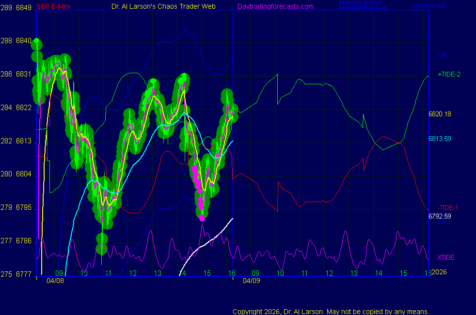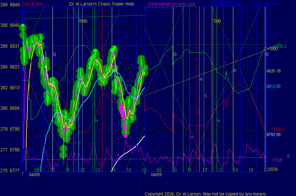Today: as per chart 3 on SPKISS page 10:28 440, 220, 110 down; sell 6600 sto9pped 6580 for +20 12:15 440, 220, 110 up; buy 6620; stopped for +7 14:24 440, 220, 110 down; sell 6818 stopped 6608 for +10 Tomorrow: Moon square Neptune **************************************************************************** during these volatile times, the point values in these instructions should multiplied by 5 ***************************************************************************** For trade times before 11:00, be sure to use EXMA's that include data from 8:15 Eastern Normal Rules ( as published on daytrading forecasts.com in the tutorial): These fit a Trend or Trend continuation scenario, identified by prices trading within a couple of points of the 110 minute EXMA, taking profits on a 12 point range. 1. Watch for the opportunity to go with the trend or change in trend at the time(s) given. Be alert for the turn coming early or late. Be patient and use the tracking indicators. Plan to trade in the direction of the 110 EXMA coming out of that time frame. Prices should stay on one side of the 110 EXMA and it should be moving, or curl up or down from a flat position. Prices should be within about 2 points of the 110 EXMA. The 20 minute EXMA should have crossed the 110 EXMA, or moved toward it and then pulled away from it. When this setup is clear, enter in the direction of the 110 EXMA with a 3 point stop. *** in volatile markets this may need to be 6 points If each setup is not clear 60 minutes after the given time, skip the trade. 2. Move the stop 1 point each 30 minutes. If the market moves decently, trail it by 3 points ( 6 points in volatile markets). 3. Cover on a 5 point gain**, 90 minutes after entry , at the next Tide turn , or if the prices clearly recross the 110 minute EXMA. ********************************************************************** **FAST MOVE RULE If the trade gains 3 points within 30 minutes of entry, press the stop, using the 20 EXMA as a guide to move the stop to the low or high of each pullback (normally about 15 minutes long) once the move makes a new high or low. Cover any gain of 9* points. *It is OK to use the fast stop rule if a trade starts fast, but to then cover at +5 or +4 if it slows or stalls *** Stall rule: Cover any trade that stalls for more than 45 minutes *** Carry through rule If you are in a trade that is working well, if is OK to carry through the next Tide turn *** GO BIG rule: if morning is a big move (>12 points ), and midday is a congestion or pullback, and the last trade of the day sets up near 2:00, a move greater than 9 points may be captured using the technique illustrated at http://moneytide.com/hans/cc09092008.asp *** VOLATILE MARKET RULE -use with discretion in volatile markets, the 55 minute EXMA used in place of the 110 minute EXMA may provide an earlier and lower risk entry. This is most useful when the market is extremely oversold or overbought and reversing, or during a fast move with minimal dips and one is looking to join the move. |