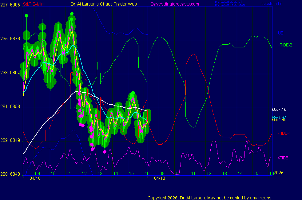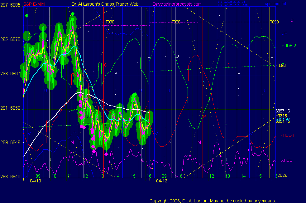 Today: as per chart 3 on SPKISS page 10:09 440, 220, 110 up; bought 6825 carried through 12:05 stopped 6860 for +35 14:24 440 up,220 down-passed Tomorrow: Moon square Chiron **************************************************************************** during these volatile times, the point values in these instructions should multiplied by 5 ***************************************************************************** For trade times before 11:00, be sure to use EXMA's that include data from 8:15 Eastern Normal Rules ( as published on daytrading forecasts.com in the tutorial): These fit a Trend or Trend continuation scenario, identified by prices trading within a couple of points of the 110 minute EXMA, taking profits on a 12 point range. 1. Watch for the opportunity to go with the trend or change in trend at the time(s) given. Be alert for the turn coming early or late. Be patient and use the tracking indicators. Plan to trade in the direction of the 110 EXMA coming out of that time frame. Prices should stay on one side of the 110 EXMA and it should be moving, or curl up or down from a flat position. Prices should be within about 2 points of the 110 EXMA. The 20 minute EXMA should have crossed the 110 EXMA, or moved toward it and then pulled away from it. When this setup is clear, enter in the direction of the 110 EXMA with a 3 point stop. *** in volatile markets this may need to be 6 points If each setup is not clear 60 minutes after the given time, skip the trade. 2. Move the stop 1 point each 30 minutes. If the market moves decently, trail it by 3 points ( 6 points in volatile markets). 3. Cover on a 5 point gain**, 90 minutes after entry , at the next Tide turn , or if the prices clearly recross the 110 minute EXMA. ********************************************************************** **FAST MOVE RULE If the trade gains 3 points within 30 minutes of entry, press the stop, using the 20 EXMA as a guide to move the stop to the low or high of each pullback (normally about 15 minutes long) once the move makes a new high or low. Cover any gain of 9* points. *It is OK to use the fast stop rule if a trade starts fast, but to then cover at +5 or +4 if it slows or stalls *** Stall rule: Cover any trade that stalls for more than 45 minutes *** Carry through rule If you are in a trade that is working well, if is OK to carry through the next Tide turn *** GO BIG rule: if morning is a big move (>12 points ), and midday is a congestion or pullback, and the last trade of the day sets up near 2:00, a move greater than 9 points may be captured using the technique illustrated at http://moneytide.com/hans/cc09092008.asp *** VOLATILE MARKET RULE -use with discretion in volatile markets, the 55 minute EXMA used in place of the 110 minute EXMA may provide an earlier and lower risk entry. This is most useful when the market is extremely oversold or overbought and reversing, or during a fast move with minimal dips and one is looking to join the move. |