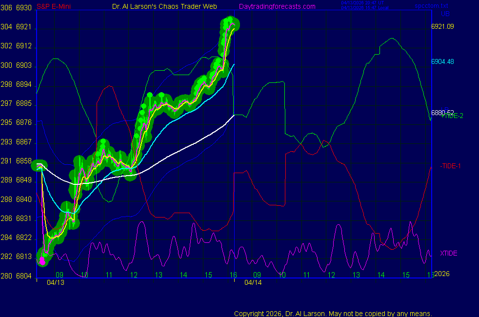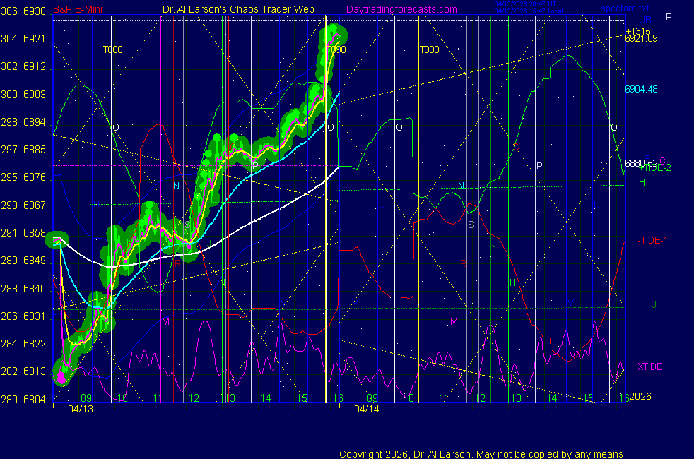 Today: as per Chaos Clinic +15 Tomorrow: Moon conjoin Node, square Uranus, octile Sun, octile Jupiter Two Moon day, often volatile and one way goes Moon to Moon, o rMoon-Noon-Moon **************************************************************************** during these volatile times, the point values in these instructions should multiplied by 5 ***************************************************************************** For trade times before 11:00, be sure to use EXMA's that include data from 8:15 Eastern Normal Rules ( as published on daytrading forecasts.com in the tutorial): These fit a Trend or Trend continuation scenario, identified by prices trading within a couple of points of the 110 minute EXMA, taking profits on a 12 point range. 1. Watch for the opportunity to go with the trend or change in trend at the time(s) given. Be alert for the turn coming early or late. Be patient and use the tracking indicators. Plan to trade in the direction of the 110 EXMA coming out of that time frame. Prices should stay on one side of the 110 EXMA and it should be moving, or curl up or down from a flat position. Prices should be within about 2 points of the 110 EXMA. The 20 minute EXMA should have crossed the 110 EXMA, or moved toward it and then pulled away from it. When this setup is clear, enter in the direction of the 110 EXMA with a 3 point stop. *** in volatile markets this may need to be 6 points If each setup is not clear 60 minutes after the given time, skip the trade. 2. Move the stop 1 point each 30 minutes. If the market moves decently, trail it by 3 points ( 6 points in volatile markets). 3. Cover on a 5 point gain**, 90 minutes after entry , at the next Tide turn , or if the prices clearly recross the 110 minute EXMA. ********************************************************************** **FAST MOVE RULE If the trade gains 3 points within 30 minutes of entry, press the stop, using the 20 EXMA as a guide to move the stop to the low or high of each pullback (normally about 15 minutes long) once the move makes a new high or low. Cover any gain of 9* points. *It is OK to use the fast stop rule if a trade starts fast, but to then cover at +5 or +4 if it slows or stalls *** Stall rule: Cover any trade that stalls for more than 45 minutes *** Carry through rule If you are in a trade that is working well, if is OK to carry through the next Tide turn *** GO BIG rule: if morning is a big move (>12 points ), and midday is a congestion or pullback, and the last trade of the day sets up near 2:00, a move greater than 9 points may be captured using the technique illustrated at http://moneytide.com/hans/cc09092008.asp *** VOLATILE MARKET RULE -use with discretion in volatile markets, the 55 minute EXMA used in place of the 110 minute EXMA may provide an earlier and lower risk entry. This is most useful when the market is extremely oversold or overbought and reversing, or during a fast move with minimal dips and one is looking to join the move. |