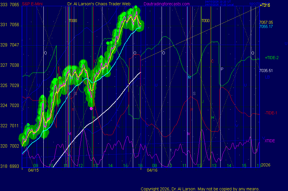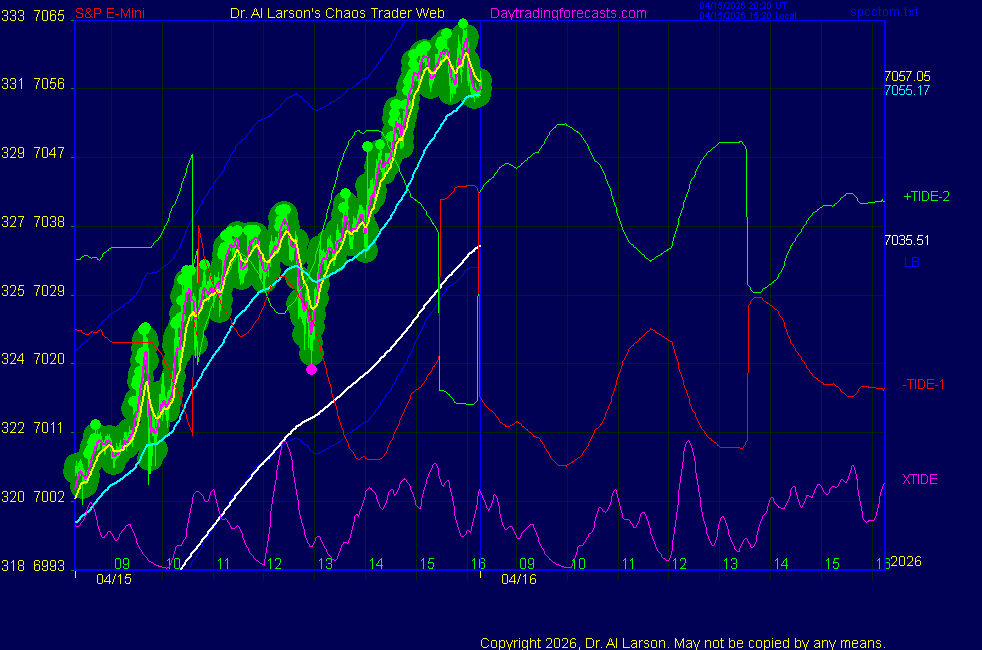 Today: as per chart 3 of SPKISS page 09:45 440, 220, 110 up; buy 6945 carried through 11:55 stopped 6993 for +48 14:38 440, 220, 110 up; buy 6992 covered 7002 for +10 Tomorrow: Moon conjoin Mercury **************************************************************************** during these volatile times, the point values in these instructions should multiplied by 5 ***************************************************************************** For trade times before 11:00, be sure to use EXMA's that include data from 8:15 Eastern Normal Rules ( as published on daytrading forecasts.com in the tutorial): These fit a Trend or Trend continuation scenario, identified by prices trading within a couple of points of the 110 minute EXMA, taking profits on a 12 point range. 1. Watch for the opportunity to go with the trend or change in trend at the time(s) given. Be alert for the turn coming early or late. Be patient and use the tracking indicators. Plan to trade in the direction of the 110 EXMA coming out of that time frame. Prices should stay on one side of the 110 EXMA and it should be moving, or curl up or down from a flat position. Prices should be within about 2 points of the 110 EXMA. The 20 minute EXMA should have crossed the 110 EXMA, or moved toward it and then pulled away from it. When this setup is clear, enter in the direction of the 110 EXMA with a 3 point stop. *** in volatile markets this may need to be 6 points If each setup is not clear 60 minutes after the given time, skip the trade. 2. Move the stop 1 point each 30 minutes. If the market moves decently, trail it by 3 points ( 6 points in volatile markets). 3. Cover on a 5 point gain**, 90 minutes after entry , at the next Tide turn , or if the prices clearly recross the 110 minute EXMA. ********************************************************************** **FAST MOVE RULE If the trade gains 3 points within 30 minutes of entry, press the stop, using the 20 EXMA as a guide to move the stop to the low or high of each pullback (normally about 15 minutes long) once the move makes a new high or low. Cover any gain of 9* points. *It is OK to use the fast stop rule if a trade starts fast, but to then cover at +5 or +4 if it slows or stalls *** Stall rule: Cover any trade that stalls for more than 45 minutes *** Carry through rule If you are in a trade that is working well, if is OK to carry through the next Tide turn *** GO BIG rule: if morning is a big move (>12 points ), and midday is a congestion or pullback, and the last trade of the day sets up near 2:00, a move greater than 9 points may be captured using the technique illustrated at http://moneytide.com/hans/cc09092008.asp *** VOLATILE MARKET RULE -use with discretion in volatile markets, the 55 minute EXMA used in place of the 110 minute EXMA may provide an earlier and lower risk entry. This is most useful when the market is extremely oversold or overbought and reversing, or during a fast move with minimal dips and one is looking to join the move. |