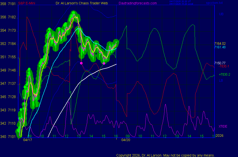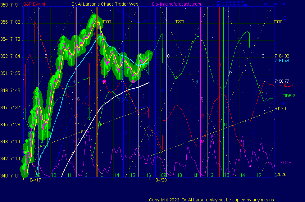Today: as per chart 3 of SPKISS page 10:00 440, 220, 110 down; sold 7065 stopped for +4 13:42 440 up, 220 down - passed Tomorrow: Moon conjoin Sun/Chiron su **************************************************************************** during these volatile times, the point values in these instructions should multiplied by 5 ***************************************************************************** For trade times before 11:00, be sure to use EXMA's that include data from 8:15 Eastern Normal Rules ( as published on daytrading forecasts.com in the tutorial): These fit a Trend or Trend continuation scenario, identified by prices trading within a couple of points of the 110 minute EXMA, taking profits on a 12 point range. 1. Watch for the opportunity to go with the trend or change in trend at the time(s) given. Be alert for the turn coming early or late. Be patient and use the tracking indicators. Plan to trade in the direction of the 110 EXMA coming out of that time frame. Prices should stay on one side of the 110 EXMA and it should be moving, or curl up or down from a flat position. Prices should be within about 2 points of the 110 EXMA. The 20 minute EXMA should have crossed the 110 EXMA, or moved toward it and then pulled away from it. When this setup is clear, enter in the direction of the 110 EXMA with a 3 point stop. *** in volatile markets this may need to be 6 points If each setup is not clear 60 minutes after the given time, skip the trade. 2. Move the stop 1 point each 30 minutes. If the market moves decently, trail it by 3 points ( 6 points in volatile markets). 3. Cover on a 5 point gain**, 90 minutes after entry , at the next Tide turn , or if the prices clearly recross the 110 minute EXMA. ********************************************************************** **FAST MOVE RULE If the trade gains 3 points within 30 minutes of entry, press the stop, using the 20 EXMA as a guide to move the stop to the low or high of each pullback (normally about 15 minutes long) once the move makes a new high or low. Cover any gain of 9* points. *It is OK to use the fast stop rule if a trade starts fast, but to then cover at +5 or +4 if it slows or stalls *** Stall rule: Cover any trade that stalls for more than 45 minutes *** Carry through rule If you are in a trade that is working well, if is OK to carry through the next Tide turn *** GO BIG rule: if morning is a big move (>12 points ), and midday is a congestion or pullback, and the last trade of the day sets up near 2:00, a move greater than 9 points may be captured using the technique illustrated at http://moneytide.com/hans/cc09092008.asp *** VOLATILE MARKET RULE -use with discretion in volatile markets, the 55 minute EXMA used in place of the 110 minute EXMA may provide an earlier and lower risk entry. This is most useful when the market is extremely oversold or overbought and reversing, or during a fast move with minimal dips and one is looking to join the move. |