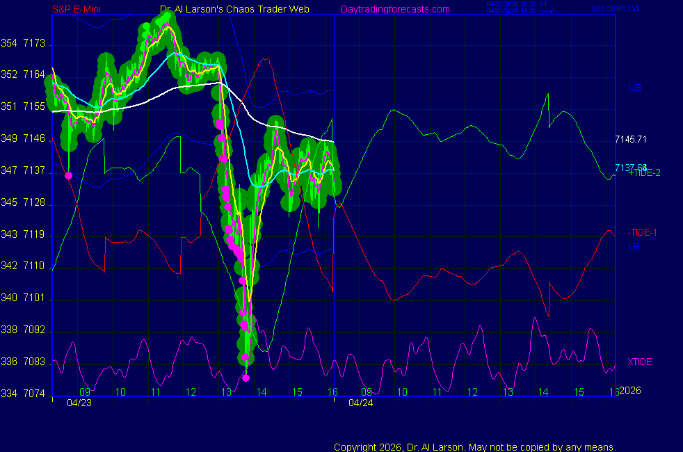 Today: as per Chart 3 of SPKISS page 10:34 440, 220, 110 up; buy 7155 stopped for +3 13:18 440, 220, 110 up; buy 7158 aborted for 0 14:34 440 up, 220 flat, 110 down -pass Tomorrow: Moon square Chiron **************************************************************************** during these volatile times, the point values in these instructions should multiplied by 5 ***************************************************************************** For trade times before 11:00, be sure to use EXMA's that include data from 8:15 Eastern Normal Rules ( as published on daytrading forecasts.com in the tutorial): These fit a Trend or Trend continuation scenario, identified by prices trading within a couple of points of the 110 minute EXMA, taking profits on a 12 point range. 1. Watch for the opportunity to go with the trend or change in trend at the time(s) given. Be alert for the turn coming early or late. Be patient and use the tracking indicators. Plan to trade in the direction of the 110 EXMA coming out of that time frame. Prices should stay on one side of the 110 EXMA and it should be moving, or curl up or down from a flat position. Prices should be within about 2 points of the 110 EXMA. The 20 minute EXMA should have crossed the 110 EXMA, or moved toward it and then pulled away from it. When this setup is clear, enter in the direction of the 110 EXMA with a 3 point stop. *** in volatile markets this may need to be 6 points If each setup is not clear 60 minutes after the given time, skip the trade. 2. Move the stop 1 point each 30 minutes. If the market moves decently, trail it by 3 points ( 6 points in volatile markets). 3. Cover on a 5 point gain**, 90 minutes after entry , at the next Tide turn , or if the prices clearly recross the 110 minute EXMA. ********************************************************************** **FAST MOVE RULE If the trade gains 3 points within 30 minutes of entry, press the stop, using the 20 EXMA as a guide to move the stop to the low or high of each pullback (normally about 15 minutes long) once the move makes a new high or low. Cover any gain of 9* points. *It is OK to use the fast stop rule if a trade starts fast, but to then cover at +5 or +4 if it slows or stalls *** Stall rule: Cover any trade that stalls for more than 45 minutes *** Carry through rule If you are in a trade that is working well, if is OK to carry through the next Tide turn *** GO BIG rule: if morning is a big move (>12 points ), and midday is a congestion or pullback, and the last trade of the day sets up near 2:00, a move greater than 9 points may be captured using the technique illustrated at http://moneytide.com/hans/cc09092008.asp *** VOLATILE MARKET RULE -use with discretion in volatile markets, the 55 minute EXMA used in place of the 110 minute EXMA may provide an earlier and lower risk entry. This is most useful when the market is extremely oversold or overbought and reversing, or during a fast move with minimal dips and one is looking to join the move. |