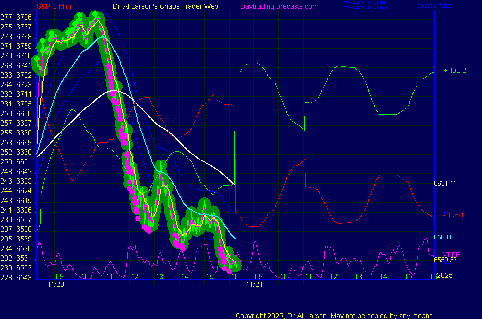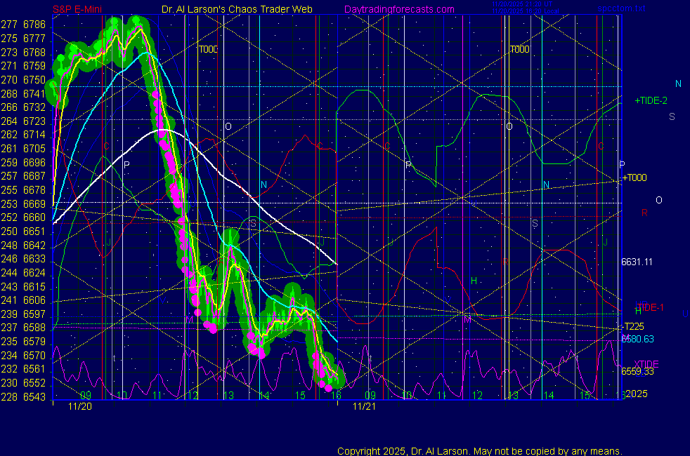 Today: as per chart 3 on SPKISS page 10:58 bought 6659 stopped 6679 for +20 13:12 sold 6655 stopped for +5 **************************************************************************** during these volatile times, the point values in these instructions should multiplied by 5 ***************************************************************************** For trade times before 11:00, be sure to use EXMA's that include data from 8:15 Eastern Normal Rules ( as published on daytrading forecasts.com in the tutorial): These fit a Trend or Trend continuation scenario, identified by prices trading within a couple of points of the 110 minute EXMA, taking profits on a 12 point range. 1. Watch for the opportunity to go with the trend or change in trend at the time(s) given. Be alert for the turn coming early or late. Be patient and use the tracking indicators. Plan to trade in the direction of the 110 EXMA coming out of that time frame. Prices should stay on one side of the 110 EXMA and it should be moving, or curl up or down from a flat position. Prices should be within about 2 points of the 110 EXMA. The 20 minute EXMA should have crossed the 110 EXMA, or moved toward it and then pulled away from it. When this setup is clear, enter in the direction of the 110 EXMA with a 3 point stop. *** in volatile markets this may need to be 6 points If each setup is not clear 60 minutes after the given time, skip the trade. 2. Move the stop 1 point each 30 minutes. If the market moves decently, trail it by 3 points ( 6 points in volatile markets). 3. Cover on a 5 point gain**, 90 minutes after entry , at the next Tide turn , or if the prices clearly recross the 110 minute EXMA. ********************************************************************** **FAST MOVE RULE If the trade gains 3 points within 30 minutes of entry, press the stop, using the 20 EXMA as a guide to move the stop to the low or high of each pullback (normally about 15 minutes long) once the move makes a new high or low. Cover any gain of 9* points. *It is OK to use the fast stop rule if a trade starts fast, but to then cover at +5 or +4 if it slows or stalls *** Stall rule: Cover any trade that stalls for more than 45 minutes *** Carry through rule If you are in a trade that is working well, if is OK to carry through the next Tide turn *** GO BIG rule: if morning is a big move (>12 points ), and midday is a congestion or pullback, and the last trade of the day sets up near 2:00, a move greater than 9 points may be captured using the technique illustrated at http://moneytide.com/hans/cc09092008.asp *** VOLATILE MARKET RULE -use with discretion in volatile markets, the 55 minute EXMA used in place of the 110 minute EXMA may provide an earlier and lower risk entry. This is most useful when the market is extremely oversold or overbought and reversing, or during a fast move with minimal dips and one is looking to join the move. |