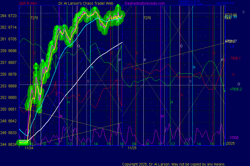 Today: as per Chaos Clinic +33 **************************************************************************** during these volatile times, the point values in these instructions should multiplied by 5 ***************************************************************************** For trade times before 11:00, be sure to use EXMA's that include data from 8:15 Eastern Normal Rules ( as published on daytrading forecasts.com in the tutorial): These fit a Trend or Trend continuation scenario, identified by prices trading within a couple of points of the 110 minute EXMA, taking profits on a 12 point range. 1. Watch for the opportunity to go with the trend or change in trend at the time(s) given. Be alert for the turn coming early or late. Be patient and use the tracking indicators. Plan to trade in the direction of the 110 EXMA coming out of that time frame. Prices should stay on one side of the 110 EXMA and it should be moving, or curl up or down from a flat position. Prices should be within about 2 points of the 110 EXMA. The 20 minute EXMA should have crossed the 110 EXMA, or moved toward it and then pulled away from it. When this setup is clear, enter in the direction of the 110 EXMA with a 3 point stop. *** in volatile markets this may need to be 6 points If each setup is not clear 60 minutes after the given time, skip the trade. 2. Move the stop 1 point each 30 minutes. If the market moves decently, trail it by 3 points ( 6 points in volatile markets). 3. Cover on a 5 point gain**, 90 minutes after entry , at the next Tide turn , or if the prices clearly recross the 110 minute EXMA. ********************************************************************** **FAST MOVE RULE If the trade gains 3 points within 30 minutes of entry, press the stop, using the 20 EXMA as a guide to move the stop to the low or high of each pullback (normally about 15 minutes long) once the move makes a new high or low. Cover any gain of 9* points. *It is OK to use the fast stop rule if a trade starts fast, but to then cover at +5 or +4 if it slows or stalls *** Stall rule: Cover any trade that stalls for more than 45 minutes *** Carry through rule If you are in a trade that is working well, if is OK to carry through the next Tide turn *** GO BIG rule: if morning is a big move (>12 points ), and midday is a congestion or pullback, and the last trade of the day sets up near 2:00, a move greater than 9 points may be captured using the technique illustrated at http://moneytide.com/hans/cc09092008.asp *** VOLATILE MARKET RULE -use with discretion in volatile markets, the 55 minute EXMA used in place of the 110 minute EXMA may provide an earlier and lower risk entry. This is most useful when the market is extremely oversold or overbought and reversing, or during a fast move with minimal dips and one is looking to join the move. |