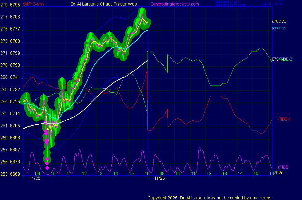 Today: as per chart 3 on the SPKISS page 09:31 440, 220, 110 up; buy 6670 carried through 13:48 stopped 6722 for +52 **************************************************************************** during these volatile times, the point values in these instructions should multiplied by 5 ***************************************************************************** For trade times before 11:00, be sure to use EXMA's that include data from 8:15 Eastern Normal Rules ( as published on daytrading forecasts.com in the tutorial): These fit a Trend or Trend continuation scenario, identified by prices trading within a couple of points of the 110 minute EXMA, taking profits on a 12 point range. 1. Watch for the opportunity to go with the trend or change in trend at the time(s) given. Be alert for the turn coming early or late. Be patient and use the tracking indicators. Plan to trade in the direction of the 110 EXMA coming out of that time frame. Prices should stay on one side of the 110 EXMA and it should be moving, or curl up or down from a flat position. Prices should be within about 2 points of the 110 EXMA. The 20 minute EXMA should have crossed the 110 EXMA, or moved toward it and then pulled away from it. When this setup is clear, enter in the direction of the 110 EXMA with a 3 point stop. *** in volatile markets this may need to be 6 points If each setup is not clear 60 minutes after the given time, skip the trade. 2. Move the stop 1 point each 30 minutes. If the market moves decently, trail it by 3 points ( 6 points in volatile markets). 3. Cover on a 5 point gain**, 90 minutes after entry , at the next Tide turn , or if the prices clearly recross the 110 minute EXMA. ********************************************************************** **FAST MOVE RULE If the trade gains 3 points within 30 minutes of entry, press the stop, using the 20 EXMA as a guide to move the stop to the low or high of each pullback (normally about 15 minutes long) once the move makes a new high or low. Cover any gain of 9* points. *It is OK to use the fast stop rule if a trade starts fast, but to then cover at +5 or +4 if it slows or stalls *** Stall rule: Cover any trade that stalls for more than 45 minutes *** Carry through rule If you are in a trade that is working well, if is OK to carry through the next Tide turn *** GO BIG rule: if morning is a big move (>12 points ), and midday is a congestion or pullback, and the last trade of the day sets up near 2:00, a move greater than 9 points may be captured using the technique illustrated at http://moneytide.com/hans/cc09092008.asp *** VOLATILE MARKET RULE -use with discretion in volatile markets, the 55 minute EXMA used in place of the 110 minute EXMA may provide an earlier and lower risk entry. This is most useful when the market is extremely oversold or overbought and reversing, or during a fast move with minimal dips and one is looking to join the move. |