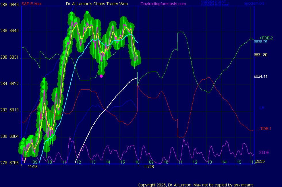 Today: as per chart 3 on the SPKISS page 10:27 440, 220, 110 up; bought 6732; carried through 12:42 stopped 6765 for +33 14:18 440 up, 110 down; passed **************************************************************************** during these volatile times, the point values in these instructions should multiplied by 5 ***************************************************************************** For trade times before 11:00, be sure to use EXMA's that include data from 8:15 Eastern Normal Rules ( as published on daytrading forecasts.com in the tutorial): These fit a Trend or Trend continuation scenario, identified by prices trading within a couple of points of the 110 minute EXMA, taking profits on a 12 point range. 1. Watch for the opportunity to go with the trend or change in trend at the time(s) given. Be alert for the turn coming early or late. Be patient and use the tracking indicators. Plan to trade in the direction of the 110 EXMA coming out of that time frame. Prices should stay on one side of the 110 EXMA and it should be moving, or curl up or down from a flat position. Prices should be within about 2 points of the 110 EXMA. The 20 minute EXMA should have crossed the 110 EXMA, or moved toward it and then pulled away from it. When this setup is clear, enter in the direction of the 110 EXMA with a 3 point stop. *** in volatile markets this may need to be 6 points If each setup is not clear 60 minutes after the given time, skip the trade. 2. Move the stop 1 point each 30 minutes. If the market moves decently, trail it by 3 points ( 6 points in volatile markets). 3. Cover on a 5 point gain**, 90 minutes after entry , at the next Tide turn , or if the prices clearly recross the 110 minute EXMA. ********************************************************************** **FAST MOVE RULE If the trade gains 3 points within 30 minutes of entry, press the stop, using the 20 EXMA as a guide to move the stop to the low or high of each pullback (normally about 15 minutes long) once the move makes a new high or low. Cover any gain of 9* points. *It is OK to use the fast stop rule if a trade starts fast, but to then cover at +5 or +4 if it slows or stalls *** Stall rule: Cover any trade that stalls for more than 45 minutes *** Carry through rule If you are in a trade that is working well, if is OK to carry through the next Tide turn *** GO BIG rule: if morning is a big move (>12 points ), and midday is a congestion or pullback, and the last trade of the day sets up near 2:00, a move greater than 9 points may be captured using the technique illustrated at http://moneytide.com/hans/cc09092008.asp *** VOLATILE MARKET RULE -use with discretion in volatile markets, the 55 minute EXMA used in place of the 110 minute EXMA may provide an earlier and lower risk entry. This is most useful when the market is extremely oversold or overbought and reversing, or during a fast move with minimal dips and one is looking to join the move. |