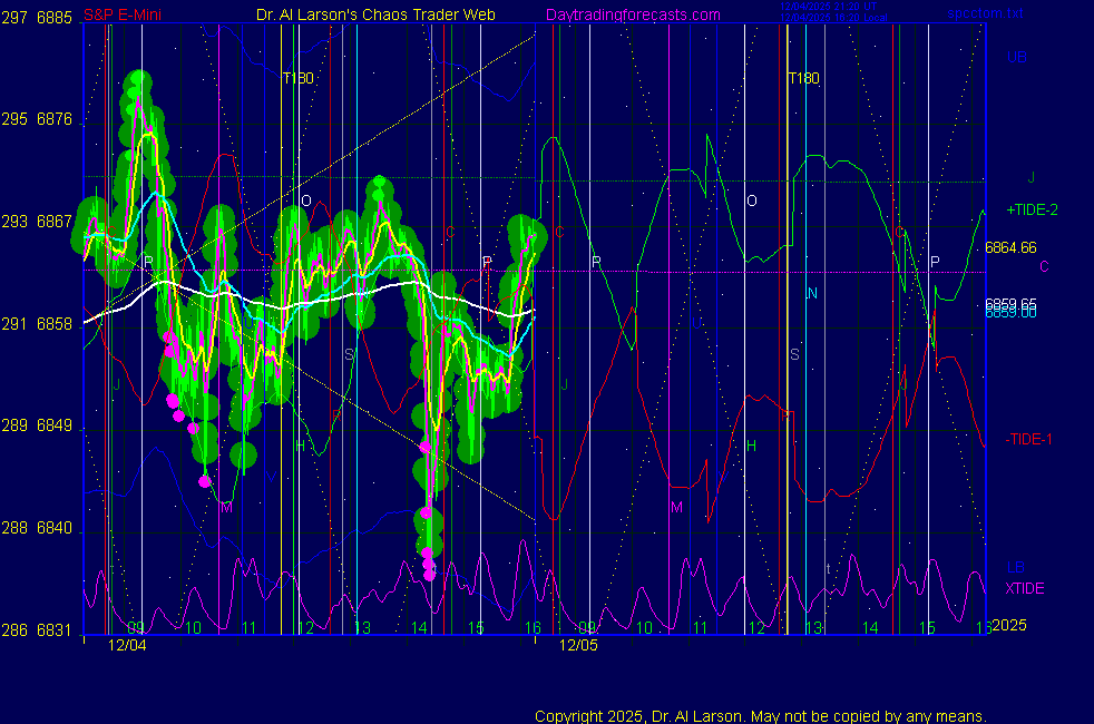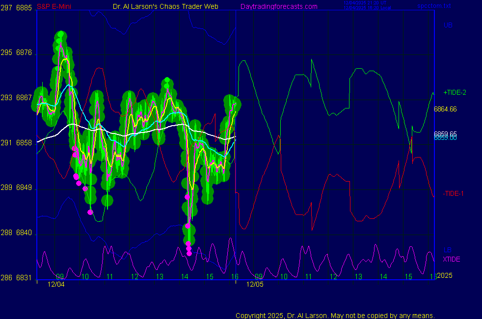 Today: as per chart 3 on the SPKISS page 09:37 sharp drop; 440, 220, 110 down; sold 6840 stopped 6830 for +10 13:22 440, 220, 110 up; buy 6854 stopped 6866 for +12 FWIW: last three days have 3 drives to a top; today broke above last three day's highs, then close4 below them **************************************************************************** during these volatile times, the point values in these instructions should multiplied by 5 ***************************************************************************** For trade times before 11:00, be sure to use EXMA's that include data from 8:15 Eastern Normal Rules ( as published on daytrading forecasts.com in the tutorial): These fit a Trend or Trend continuation scenario, identified by prices trading within a couple of points of the 110 minute EXMA, taking profits on a 12 point range. 1. Watch for the opportunity to go with the trend or change in trend at the time(s) given. Be alert for the turn coming early or late. Be patient and use the tracking indicators. Plan to trade in the direction of the 110 EXMA coming out of that time frame. Prices should stay on one side of the 110 EXMA and it should be moving, or curl up or down from a flat position. Prices should be within about 2 points of the 110 EXMA. The 20 minute EXMA should have crossed the 110 EXMA, or moved toward it and then pulled away from it. When this setup is clear, enter in the direction of the 110 EXMA with a 3 point stop. *** in volatile markets this may need to be 6 points If each setup is not clear 60 minutes after the given time, skip the trade. 2. Move the stop 1 point each 30 minutes. If the market moves decently, trail it by 3 points ( 6 points in volatile markets). 3. Cover on a 5 point gain**, 90 minutes after entry , at the next Tide turn , or if the prices clearly recross the 110 minute EXMA. ********************************************************************** **FAST MOVE RULE If the trade gains 3 points within 30 minutes of entry, press the stop, using the 20 EXMA as a guide to move the stop to the low or high of each pullback (normally about 15 minutes long) once the move makes a new high or low. Cover any gain of 9* points. *It is OK to use the fast stop rule if a trade starts fast, but to then cover at +5 or +4 if it slows or stalls *** Stall rule: Cover any trade that stalls for more than 45 minutes *** Carry through rule If you are in a trade that is working well, if is OK to carry through the next Tide turn *** GO BIG rule: if morning is a big move (>12 points ), and midday is a congestion or pullback, and the last trade of the day sets up near 2:00, a move greater than 9 points may be captured using the technique illustrated at http://moneytide.com/hans/cc09092008.asp *** VOLATILE MARKET RULE -use with discretion in volatile markets, the 55 minute EXMA used in place of the 110 minute EXMA may provide an earlier and lower risk entry. This is most useful when the market is extremely oversold or overbought and reversing, or during a fast move with minimal dips and one is looking to join the move. |