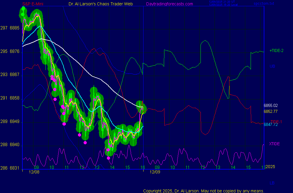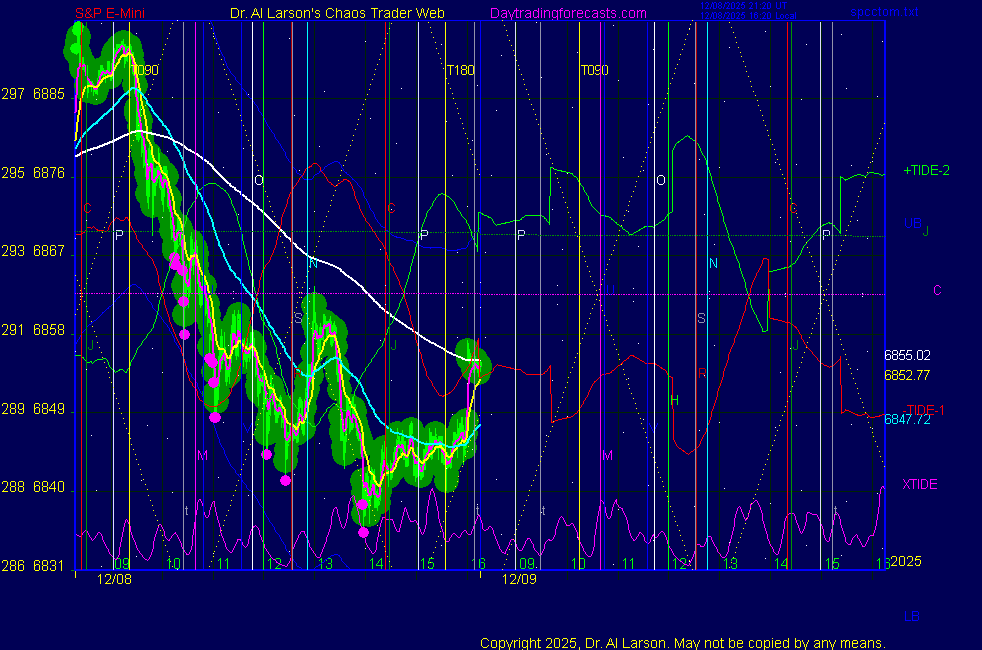 Today: as per Chaos Clinic +8 **************************************************************************** during these volatile times, the point values in these instructions should multiplied by 5 ***************************************************************************** For trade times before 11:00, be sure to use EXMA's that include data from 8:15 Eastern Normal Rules ( as published on daytrading forecasts.com in the tutorial): These fit a Trend or Trend continuation scenario, identified by prices trading within a couple of points of the 110 minute EXMA, taking profits on a 12 point range. 1. Watch for the opportunity to go with the trend or change in trend at the time(s) given. Be alert for the turn coming early or late. Be patient and use the tracking indicators. Plan to trade in the direction of the 110 EXMA coming out of that time frame. Prices should stay on one side of the 110 EXMA and it should be moving, or curl up or down from a flat position. Prices should be within about 2 points of the 110 EXMA. The 20 minute EXMA should have crossed the 110 EXMA, or moved toward it and then pulled away from it. When this setup is clear, enter in the direction of the 110 EXMA with a 3 point stop. *** in volatile markets this may need to be 6 points If each setup is not clear 60 minutes after the given time, skip the trade. 2. Move the stop 1 point each 30 minutes. If the market moves decently, trail it by 3 points ( 6 points in volatile markets). 3. Cover on a 5 point gain**, 90 minutes after entry , at the next Tide turn , or if the prices clearly recross the 110 minute EXMA. ********************************************************************** **FAST MOVE RULE If the trade gains 3 points within 30 minutes of entry, press the stop, using the 20 EXMA as a guide to move the stop to the low or high of each pullback (normally about 15 minutes long) once the move makes a new high or low. Cover any gain of 9* points. *It is OK to use the fast stop rule if a trade starts fast, but to then cover at +5 or +4 if it slows or stalls *** Stall rule: Cover any trade that stalls for more than 45 minutes *** Carry through rule If you are in a trade that is working well, if is OK to carry through the next Tide turn *** GO BIG rule: if morning is a big move (>12 points ), and midday is a congestion or pullback, and the last trade of the day sets up near 2:00, a move greater than 9 points may be captured using the technique illustrated at http://moneytide.com/hans/cc09092008.asp *** VOLATILE MARKET RULE -use with discretion in volatile markets, the 55 minute EXMA used in place of the 110 minute EXMA may provide an earlier and lower risk entry. This is most useful when the market is extremely oversold or overbought and reversing, or during a fast move with minimal dips and one is looking to join the move. |